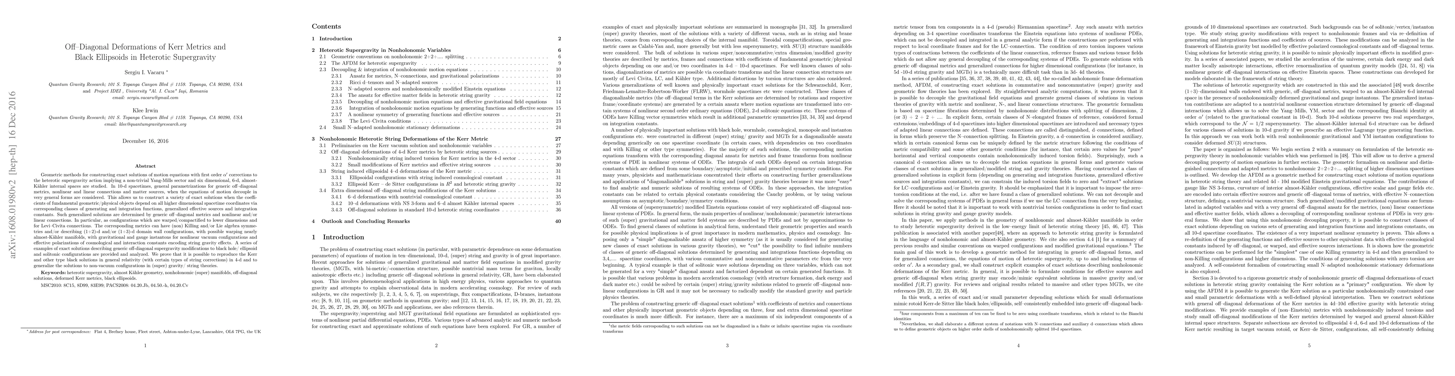This paper explores geometric methods to construct exact solutions for motion equations in heterotic supergravity with first-order $\alpha^{\prime}$ corrections, focusing on off-diagonal deformations of Kerr metrics and black ellipsoids. The study provides a variety of exact solutions for generic off-diagonal metrics and connections, demonstrating the possibility of reproducing Kerr solutions with string corrections and generalizing them to non-vacuum configurations in supergravity/string theories.