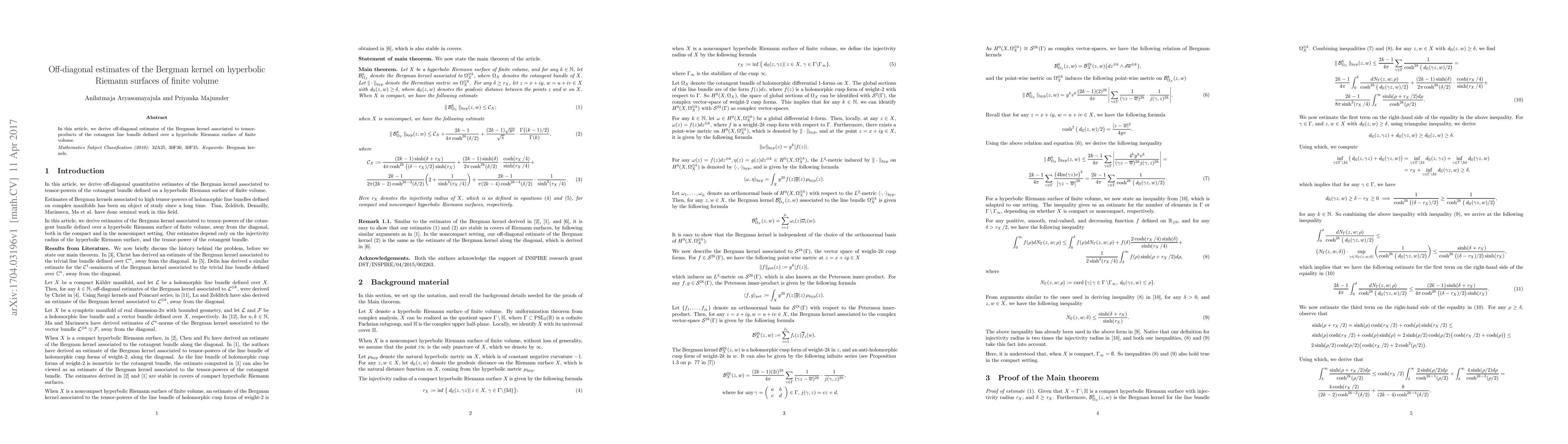 Summary: This paper presents the derivation of off-diagonal estimates for the Bergman kernel on hyperbolic Riemann surfaces of finite volume, focusing on tensor products of the cotangent line bundle. These estimates provide deeper insights into the geometric properties of the Bergman kernel.