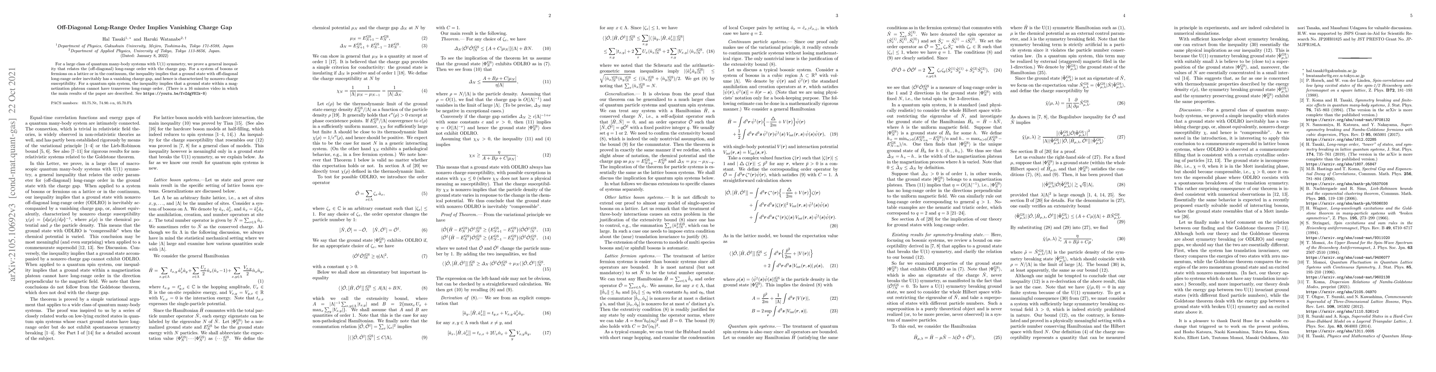 This paper proves a general inequality linking off-diagonal long-range order to the charge gap in quantum many-body systems with U(1) symmetry, showing that systems with such order exhibit a vanishing charge gap and nonzero charge susceptibility. For quantum spin systems, it indicates that magnetization plateaus cannot support transverse long-range order.