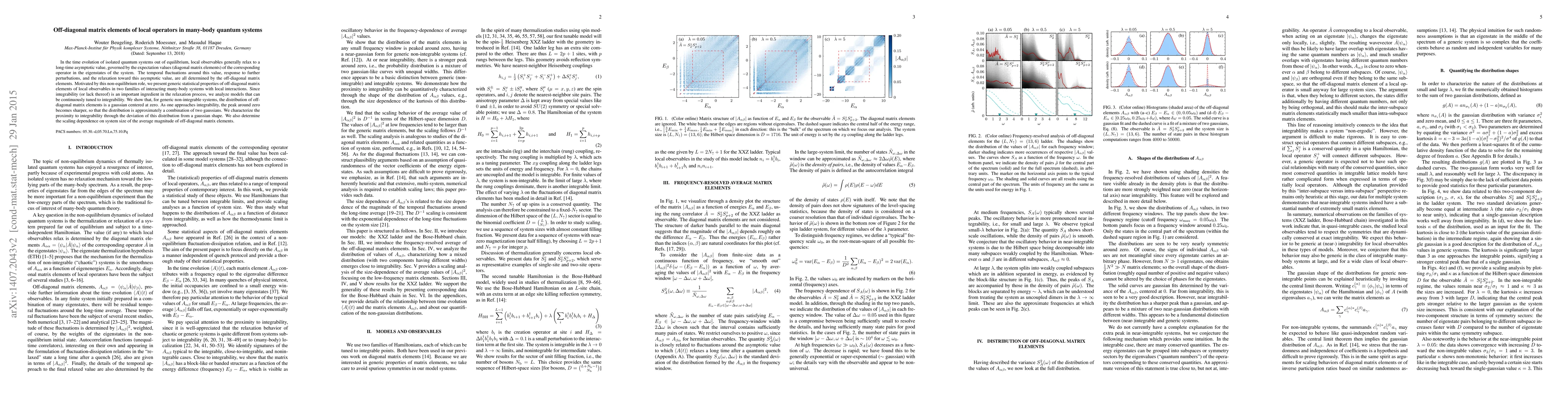This paper investigates the statistical properties of off-diagonal matrix elements of local operators in many-body quantum systems, focusing on their role in non-equilibrium dynamics. It finds that in non-integrable systems, these elements follow a Gaussian distribution centered at zero, while near integrability, the distribution becomes a combination of two Gaussians, providing a measure of proximity to integrability.