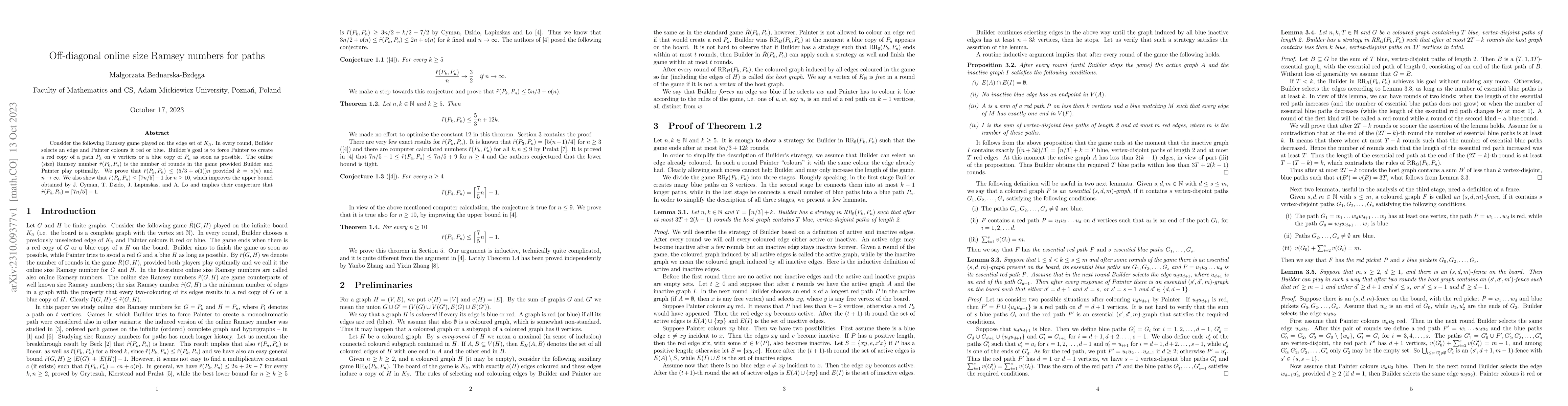 Consider the following Ramsey game played on the edge set of $K_{\mathbb N}$. In every round, Builder selects an edge and Painter colours it red or blue. Builder's goal is to force Painter to create a red copy of a path $P_k$ on $k$ vertices or a blue copy of $P_n$ as soon as possible. The online (size) Ramsey number $\tilde{r}(P_k,P_n)$ is the number of rounds in the game provided Builder and Painter play optimally. We prove that $\tilde{r}(P_k,P_n)\le (5/3+o(1))n$ provided $k=o(n)$ and $n\to \infty$. We also show that $\tilde{r}(P_4,P_n)\le \lceil 7n/5\rceil -1$ for $n\ge 10$, which improves the upper bound obtained by J.~Cyman, T.~Dzido, J.~Lapinskas, and A.~Lo and implies their conjecture that $\tilde{r}(P_4,P_n)=\lceil 7n/5\rceil -1$.