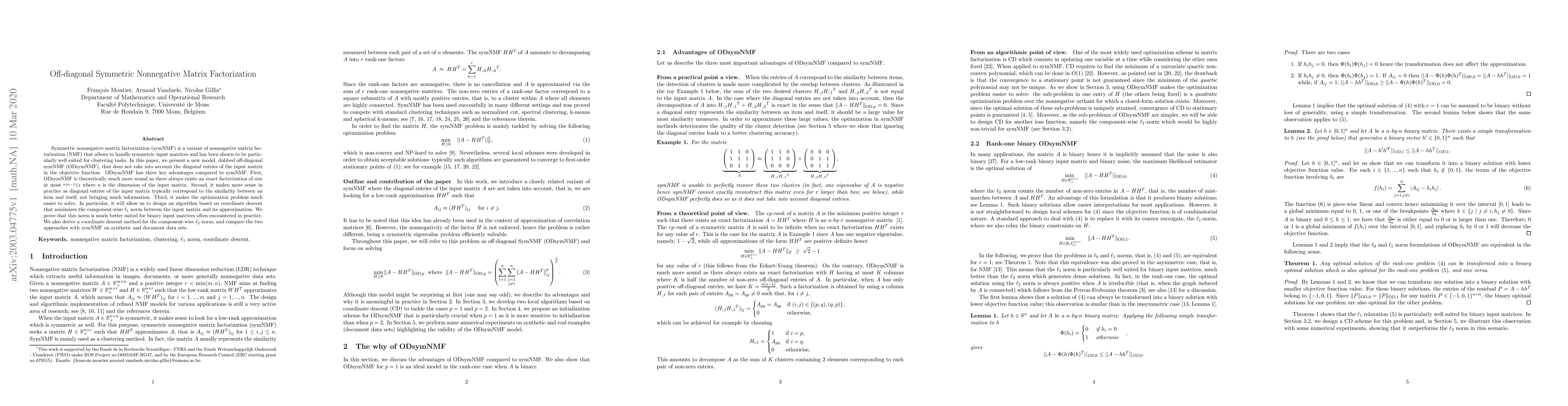 This paper introduces off-diagonal symmetric nonnegative matrix factorization (ODsymNMF), which excludes diagonal entries from the objective function, offering a more theoretically sound, practical, and easier optimization model compared to traditional symmetric NMF. The method is shown to perform better for binary input matrices and is implemented via coordinate descent.