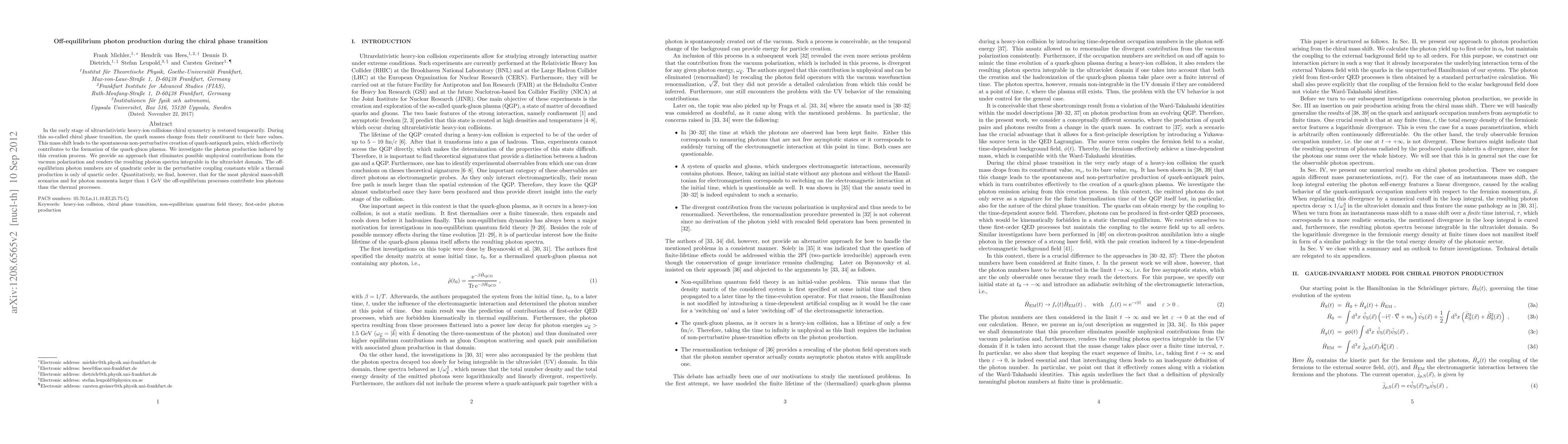 In the early stage of ultrarelativistic heavy-ion collisions chiral symmetry is restored temporarily. During this so-called chiral phase transition, the quark masses change from their constituent to their bare values. This mass shift leads to the spontaneous non-perturbative creation of quark-antiquark pairs, which effectively contributes to the formation of the quark-gluon plasma. We investigate the photon production induced by this creation process. We provide an approach that eliminates possible unphysical contributions from the vacuum polarization and renders the resulting photon spectra integrable inthe ultraviolet domain. The off-equilibrium photon numbers are of quadratic order in the perturbative coupling constants while a thermal production is only of quartic order. Quantitatively, we find, however, that for the most physical mass-shift scenarios and for photon momenta larger than 1 GeV the off-equilibrium processes contribute less photons than the thermal processes.