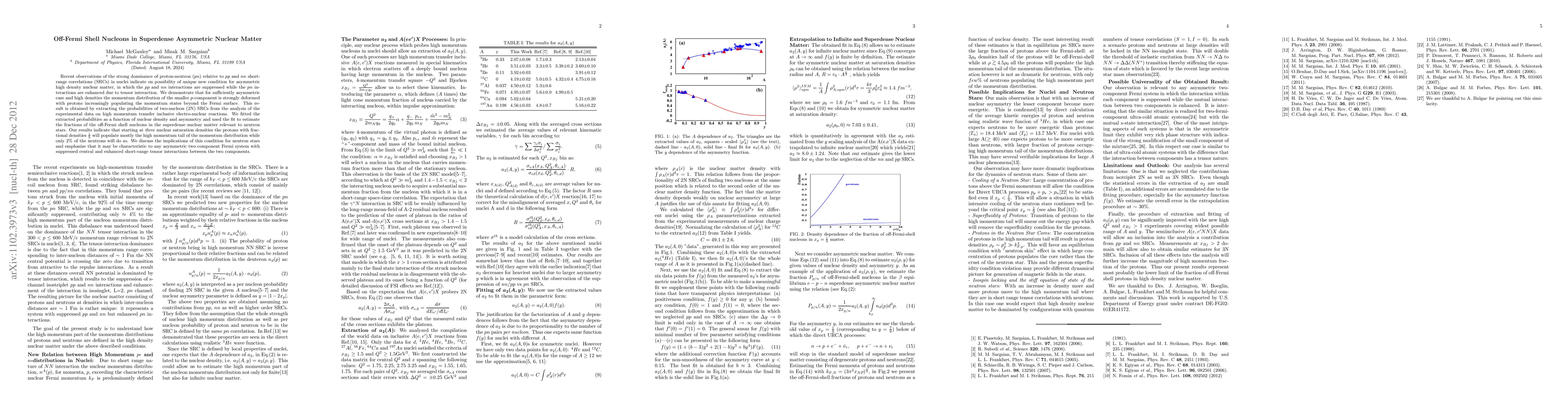 Recent observations of the strong dominance of proton-neutron (pn) relative to pp and nn short-range correlations (SRCs) in nuclei indicate on possibility of unique new condition for asymmetric high density nuclear matter, in which the pp and nn interactions are suppressed while the pn interactions are enhanced due to tensor interaction. We demonstrate that for sufficiently asymmetric case and high densities the momentum distribution of the smaller p-component is strongly deformed with protons increasingly populating the momentum states beyond the Fermi surface. This result is obtained by extracting the probabilities of two-nucleon (2N) SRCs from the analysis of the experimental data on high momentum transfer inclusive electro-nuclear reactions. We fitted the extracted probabilities as a function of nuclear density and asymmetry and used the fit to estimate the fractions of the off-Fermi shell nucleons in the superdense nuclear matter relevant to neutron stars. Our results indicate that starting at three nuclear saturation densities the protons with fractional densities 1/9 will populate mostly the high momentum tail of the momentum distribution while only 2% of the neutrons will do so. We discuss the implications of this condition for neutron stars and emphasize that it may be characteristic to any asymmetric two component Fermi system with suppressed central and enhanced short-range tensor interactions between the two components.
