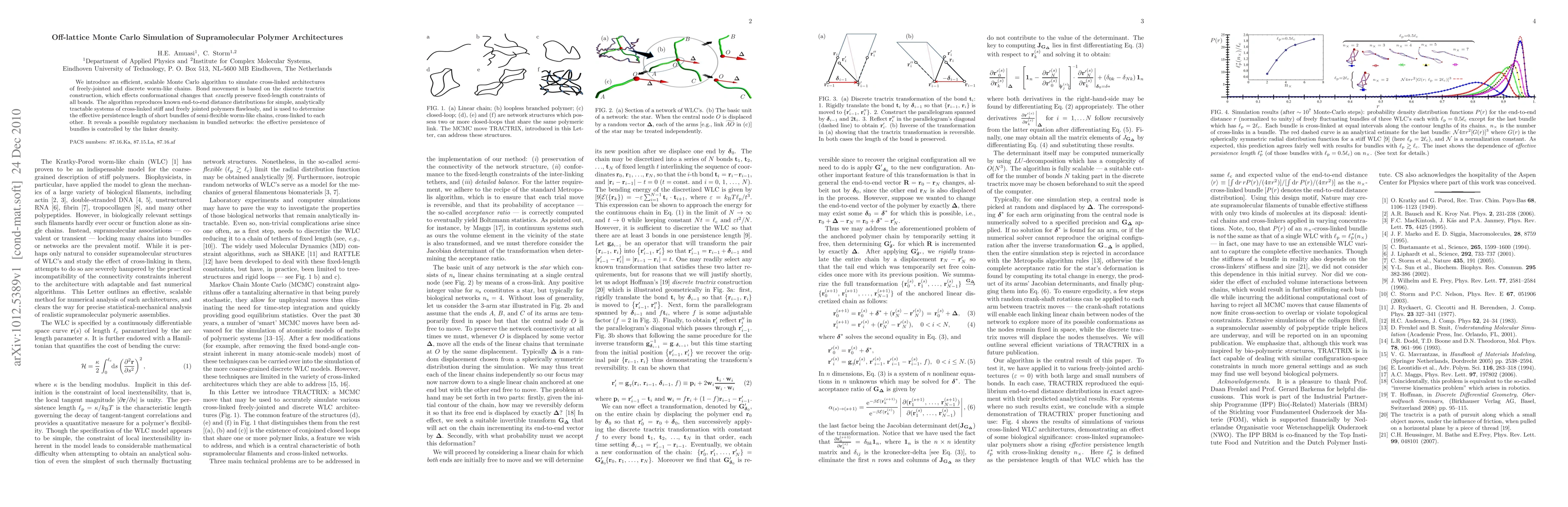 This paper presents an off-lattice Monte Carlo simulation algorithm for modeling cross-linked supramolecular polymer architectures, accurately reproducing known polymer distributions and determining the effective persistence length of semi-flexible bundles, which is regulated by linker density.