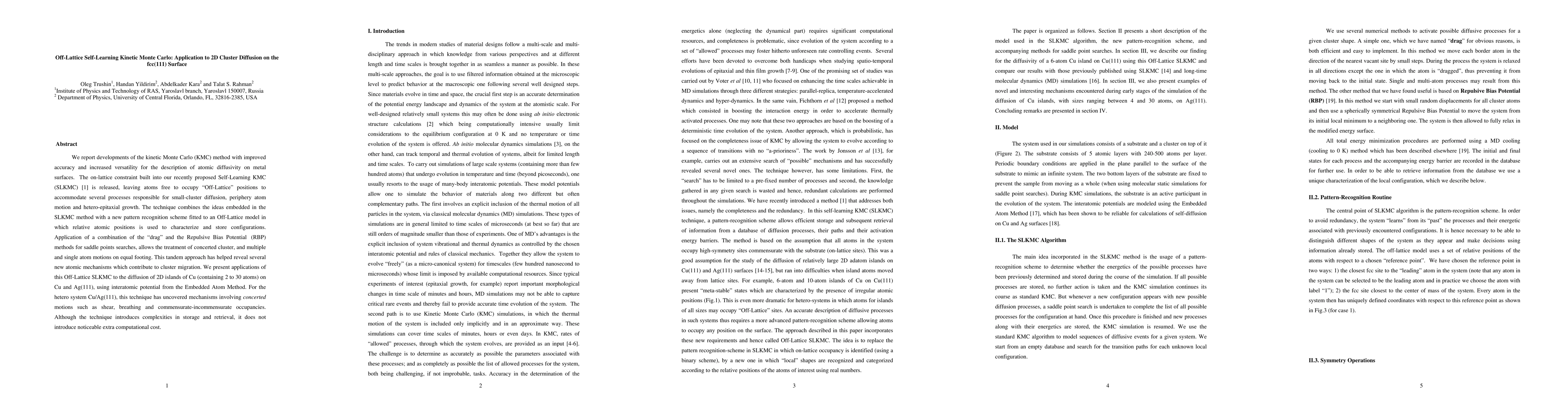 The research presents an Off-Lattice Self-Learning Kinetic Monte Carlo (SLKMC) method for simulating atomic diffusivity on metal surfaces, which was originally constrained to on-lattice positions. This new method allows atoms to occupy off-lattice positions, accommodating various processes like small-cluster diffusion, periphery atom motion, and hetero-epitaxial growth.