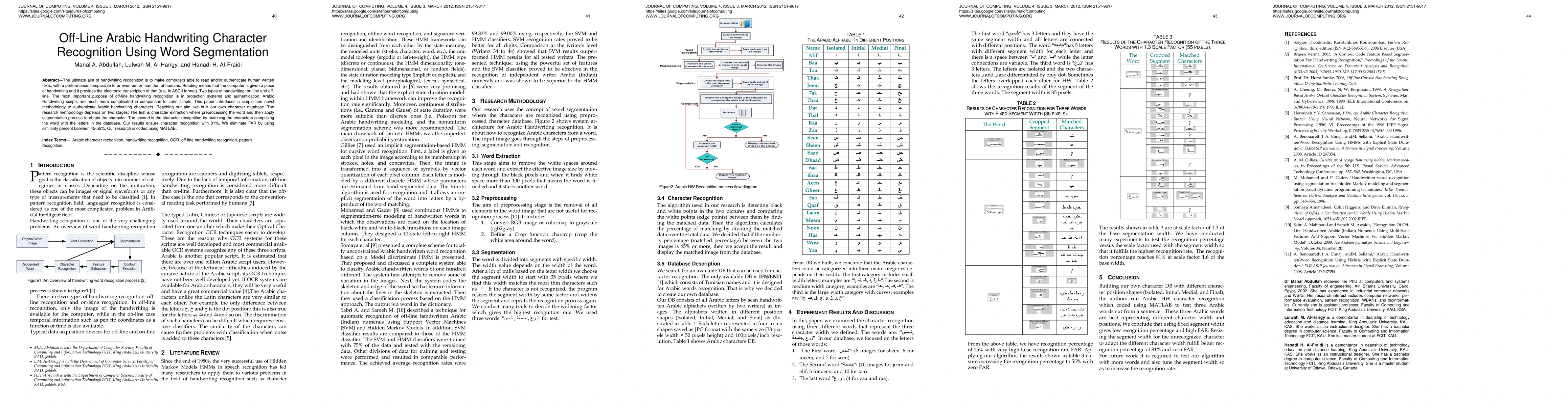 This paper presents a novel method for off-line Arabic handwriting character recognition using word segmentation, achieving 81% recognition accuracy. The approach involves character extraction and recognition by matching segmented characters against a custom database, with reduced false acceptance rate using a similarity threshold.