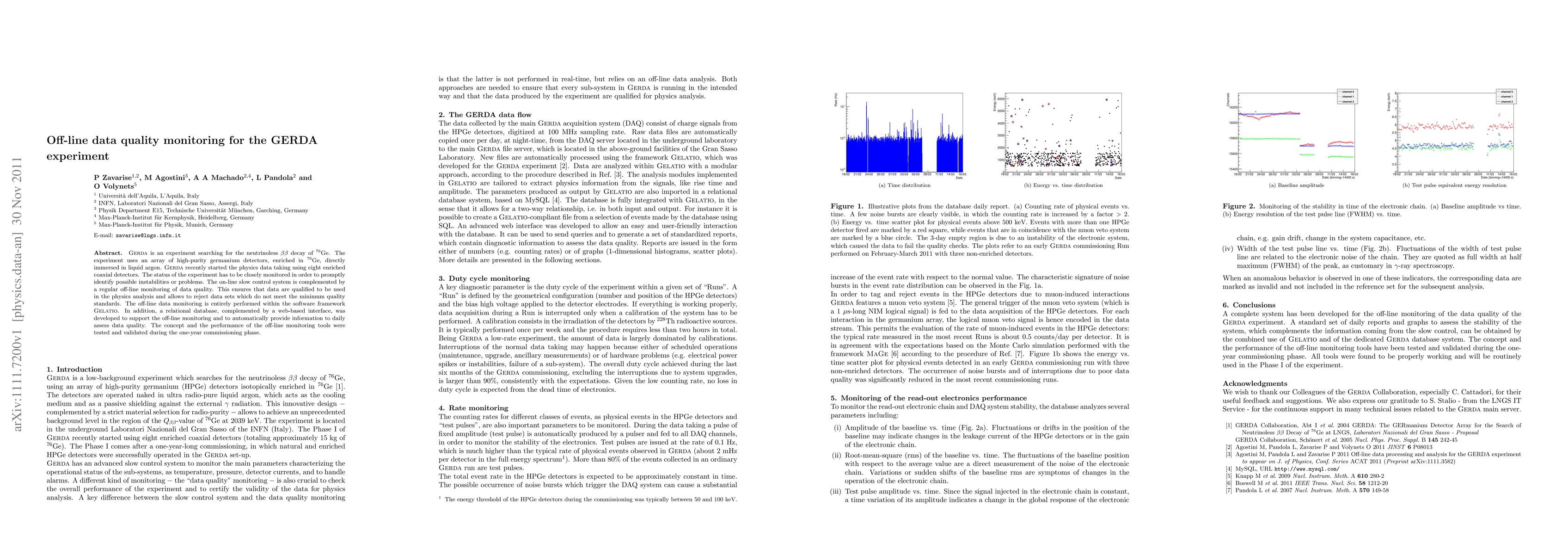 The GERDA experiment employs off-line data quality monitoring to ensure the integrity of its neutrinoless ββ decay search data, using high-purity germanium detectors immersed in liquid argon. The monitoring, conducted within GELATIO and supported by a relational database, was validated during the commissioning phase.