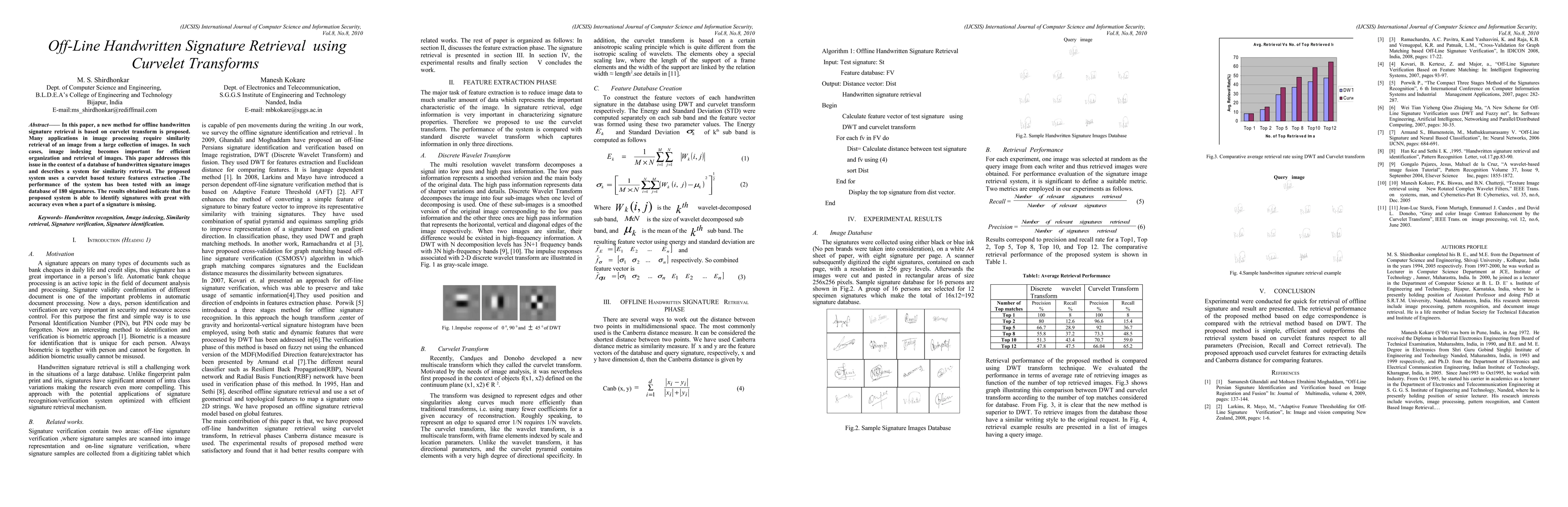 This paper proposes a new method for offline handwritten signature retrieval using curvelet transforms for texture feature extraction. The system demonstrates high accuracy in identifying signatures, even with partial data, tested on a database of 180 signatures.