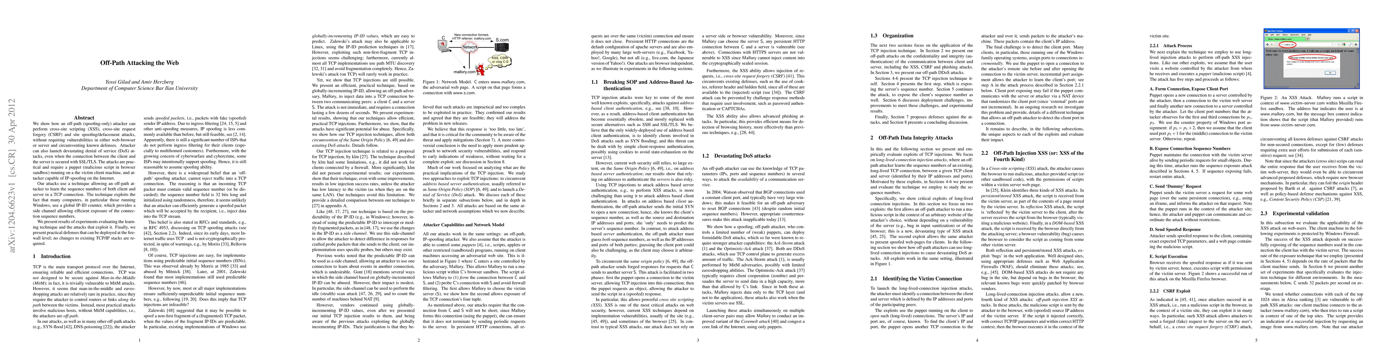 This paper demonstrates how an off-path attacker can execute XSS, CSRF, and site spoofing attacks without exploiting web-browser or server vulnerabilities, using a technique to learn TCP sequence numbers. Practical defenses at the firewall level are proposed to mitigate these attacks without altering TCP/IP stacks.