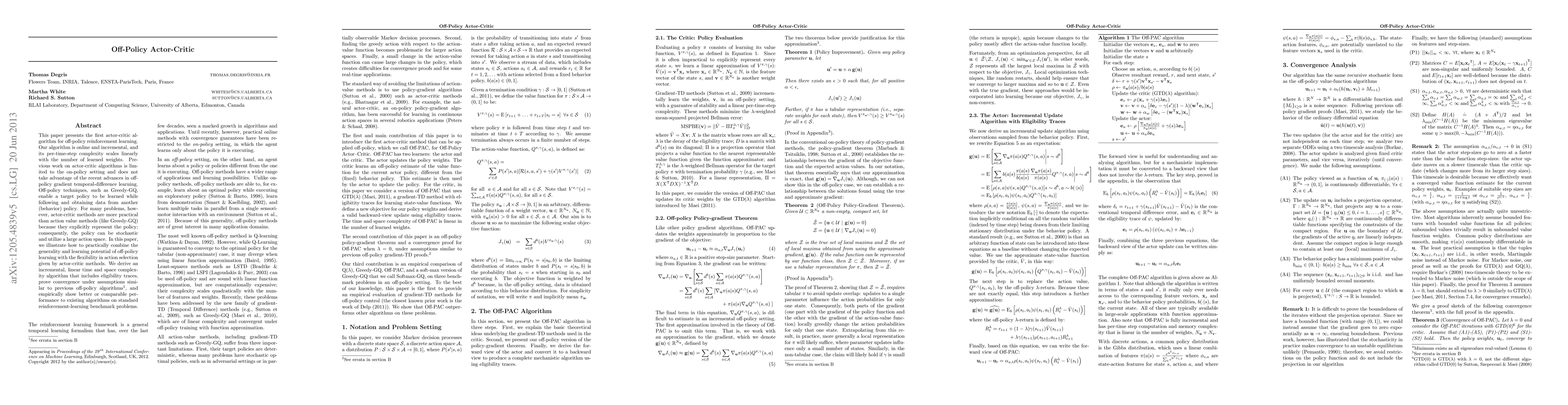 This paper presents the first actor-critic algorithm for off-policy reinforcement learning. Our algorithm is online and incremental, and its per-time-step complexity scales linearly with the number of learned weights. Previous work on actor-critic algorithms is limited to the on-policy setting and does not take advantage of the recent advances in off-policy gradient temporal-difference learning. Off-policy techniques, such as Greedy-GQ, enable a target policy to be learned while following and obtaining data from another (behavior) policy. For many problems, however, actor-critic methods are more practical than action value methods (like Greedy-GQ) because they explicitly represent the policy; consequently, the policy can be stochastic and utilize a large action space. In this paper, we illustrate how to practically combine the generality and learning potential of off-policy learning with the flexibility in action selection given by actor-critic methods. We derive an incremental, linear time and space complexity algorithm that includes eligibility traces, prove convergence under assumptions similar to previous off-policy algorithms, and empirically show better or comparable performance to existing algorithms on standard reinforcement-learning benchmark problems.