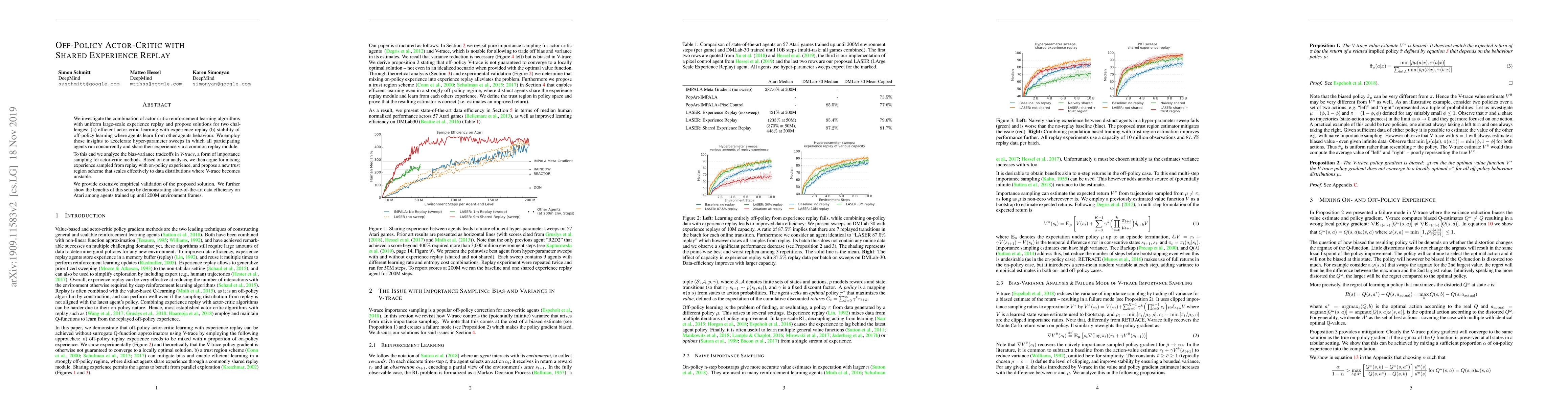 We investigate the combination of actor-critic reinforcement learning algorithms with uniform large-scale experience replay and propose solutions for two challenges: (a) efficient actor-critic learning with experience replay (b) stability of off-policy learning where agents learn from other agents behaviour. We employ those insights to accelerate hyper-parameter sweeps in which all participating agents run concurrently and share their experience via a common replay module. To this end we analyze the bias-variance tradeoffs in V-trace, a form of importance sampling for actor-critic methods. Based on our analysis, we then argue for mixing experience sampled from replay with on-policy experience, and propose a new trust region scheme that scales effectively to data distributions where V-trace becomes unstable. We provide extensive empirical validation of the proposed solution. We further show the benefits of this setup by demonstrating state-of-the-art data efficiency on Atari among agents trained up until 200M environment frames.