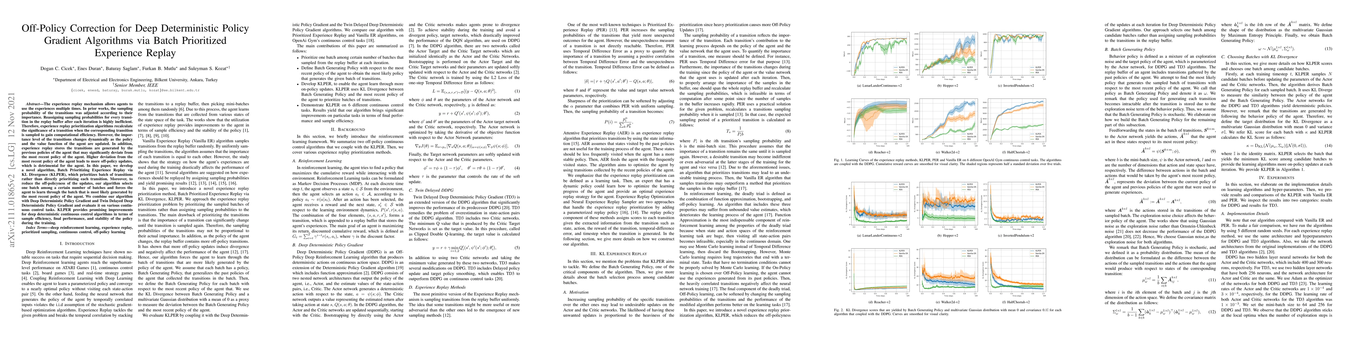 This paper introduces Batch Prioritizing Experience Replay via KL Divergence (KLPER) to improve the efficiency and performance of Deep Deterministic Policy Gradient algorithms by prioritizing batches of transitions rather than individual ones, thereby reducing off-policy updates and enhancing sample efficiency, final performance, and policy stability.