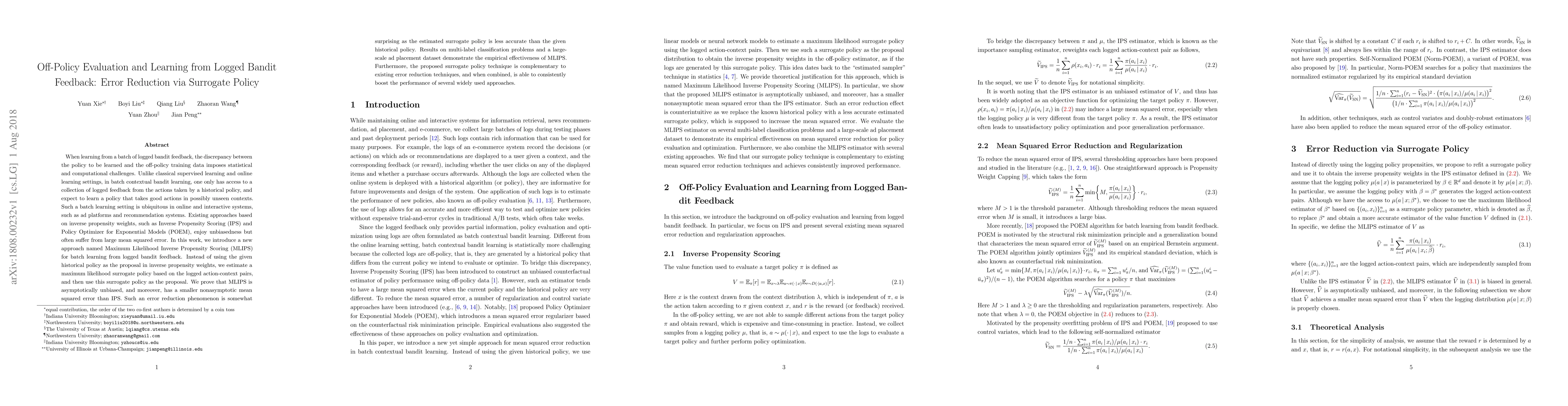 This paper introduces Maximum Likelihood Inverse Propensity Scoring (MLIPS) to improve off-policy evaluation in batch contextual bandit learning. It estimates a surrogate policy to reduce mean squared error compared to traditional methods like IPS, demonstrating improved performance on multi-label classification and ad placement datasets.