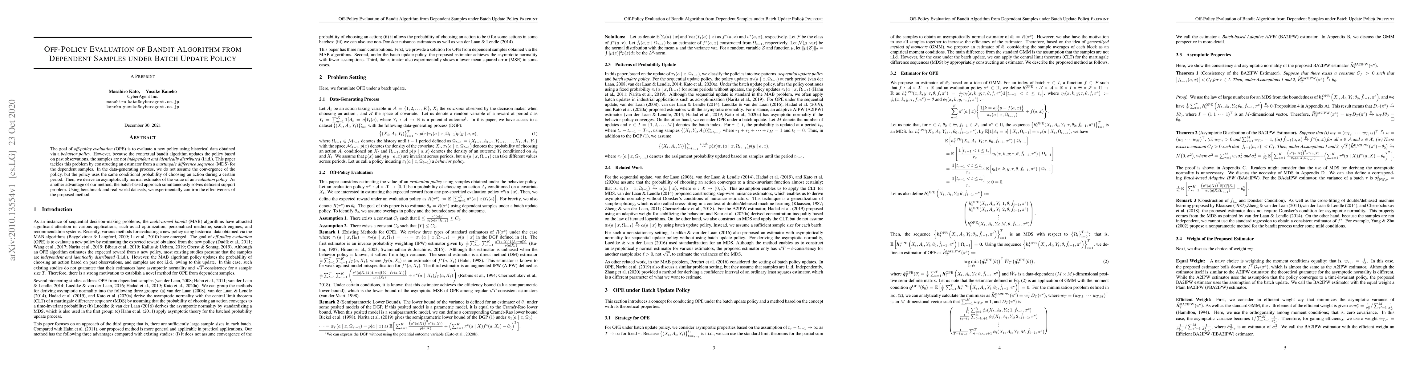 The goal of off-policy evaluation (OPE) is to evaluate a new policy using historical data obtained via a behavior policy. However, because the contextual bandit algorithm updates the policy based on past observations, the samples are not independent and identically distributed (i.i.d.). This paper tackles this problem by constructing an estimator from a martingale difference sequence (MDS) for the dependent samples. In the data-generating process, we do not assume the convergence of the policy, but the policy uses the same conditional probability of choosing an action during a certain period. Then, we derive an asymptotically normal estimator of the value of an evaluation policy. As another advantage of our method, the batch-based approach simultaneously solves the deficient support problem. Using benchmark and real-world datasets, we experimentally confirm the effectiveness of the proposed method.