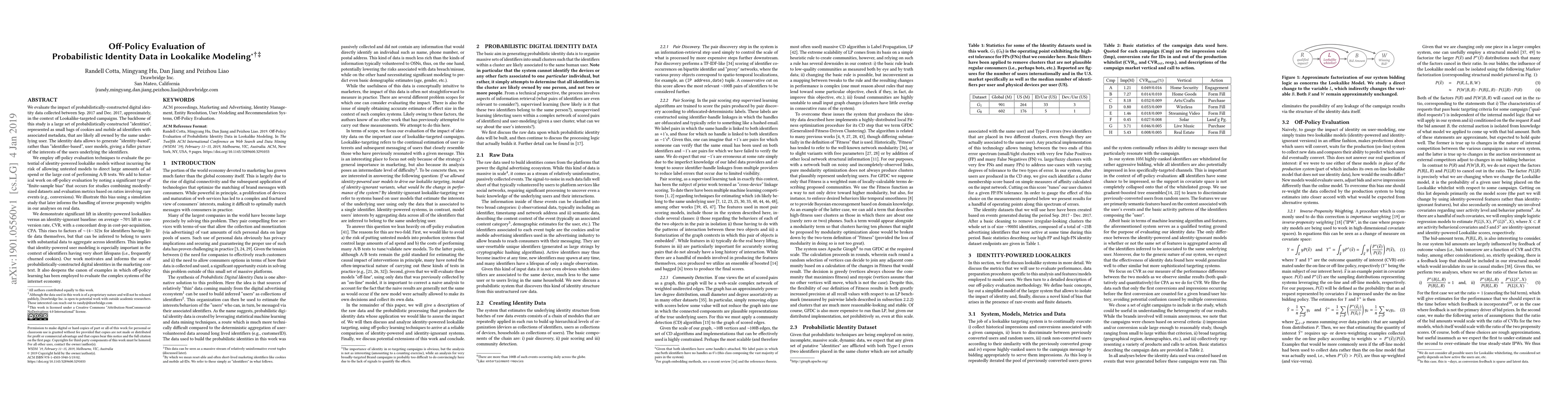 We evaluate the impact of probabilistically-constructed digital identity data collected from Sep. to Dec. 2017 (approx.), in the context of Lookalike-targeted campaigns. The backbone of this study is a large set of probabilistically-constructed "identities", represented as small bags of cookies and mobile ad identifiers with associated metadata, that are likely all owned by the same underlying user. The identity data allows to generate "identity-based", rather than "identifier-based", user models, giving a fuller picture of the interests of the users underlying the identifiers. We employ off-policy techniques to evaluate the potential of identity-powered lookalike models without incurring the risk of allowing untested models to direct large amounts of ad spend or the large cost of performing A/B tests. We add to historical work on off-policy evaluation by noting a significant type of "finite-sample bias" that occurs for studies combining modestly-sized datasets and evaluation metrics involving rare events (e.g., conversions). We illustrate this bias using a simulation study that later informs the handling of inverse propensity weights in our analyses on real data. We demonstrate significant lift in identity-powered lookalikes versus an identity-ignorant baseline: on average ~70% lift in conversion rate. This rises to factors of ~(4-32)x for identifiers having little data themselves, but that can be inferred to belong to users with substantial data to aggregate across identifiers. This implies that identity-powered user modeling is especially important in the context of identifiers having very short lifespans (i.e., frequently churned cookies). Our work motivates and informs the use of probabilistically-constructed identities in marketing. It also deepens the canon of examples in which off-policy learning has been employed to evaluate the complex systems of the internet economy.