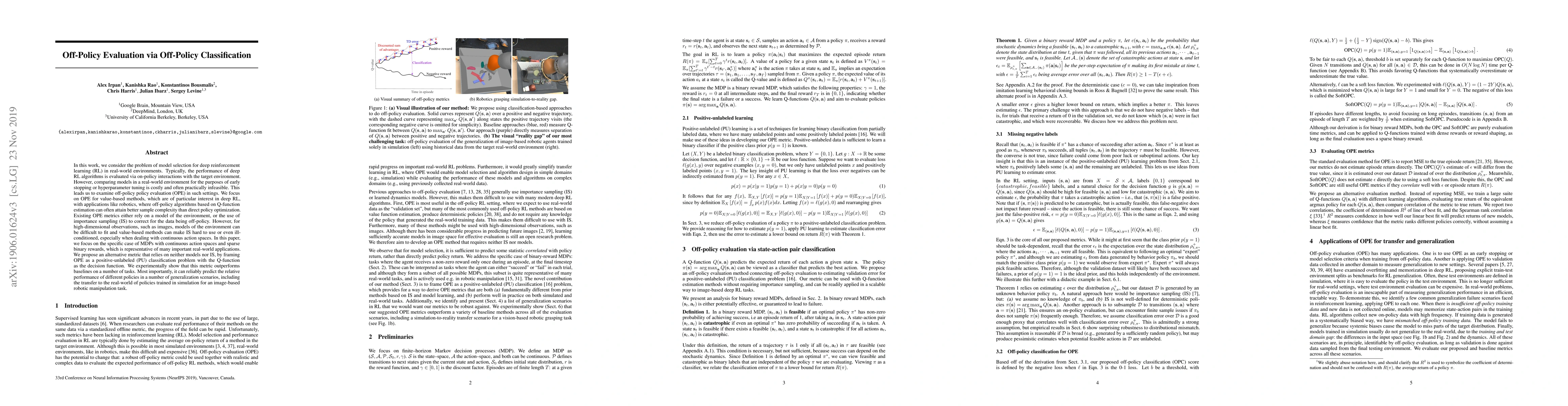 In this work, we consider the problem of model selection for deep reinforcement learning (RL) in real-world environments. Typically, the performance of deep RL algorithms is evaluated via on-policy interactions with the target environment. However, comparing models in a real-world environment for the purposes of early stopping or hyperparameter tuning is costly and often practically infeasible. This leads us to examine off-policy policy evaluation (OPE) in such settings. We focus on OPE for value-based methods, which are of particular interest in deep RL, with applications like robotics, where off-policy algorithms based on Q-function estimation can often attain better sample complexity than direct policy optimization. Existing OPE metrics either rely on a model of the environment, or the use of importance sampling (IS) to correct for the data being off-policy. However, for high-dimensional observations, such as images, models of the environment can be difficult to fit and value-based methods can make IS hard to use or even ill-conditioned, especially when dealing with continuous action spaces. In this paper, we focus on the specific case of MDPs with continuous action spaces and sparse binary rewards, which is representative of many important real-world applications. We propose an alternative metric that relies on neither models nor IS, by framing OPE as a positive-unlabeled (PU) classification problem with the Q-function as the decision function. We experimentally show that this metric outperforms baselines on a number of tasks. Most importantly, it can reliably predict the relative performance of different policies in a number of generalization scenarios, including the transfer to the real-world of policies trained in simulation for an image-based robotic manipulation task.