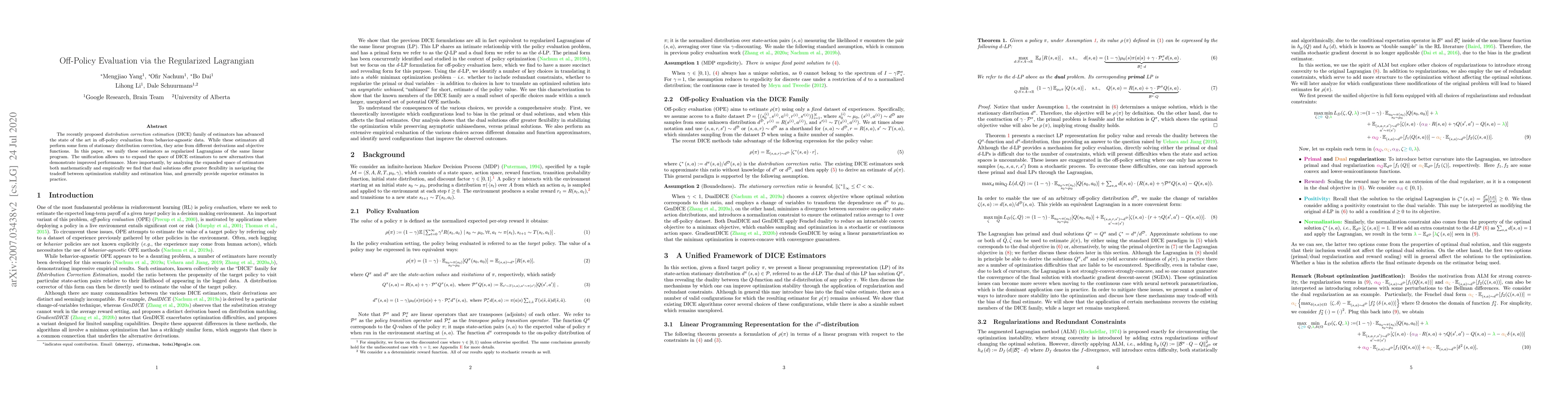 This paper unifies various distribution correction estimators under a regularized Lagrangian framework, showing that dual solutions offer improved stability and bias tradeoff, ultimately leading to better off-policy evaluation performance. The new estimators derived from this approach demonstrate superior practical results.