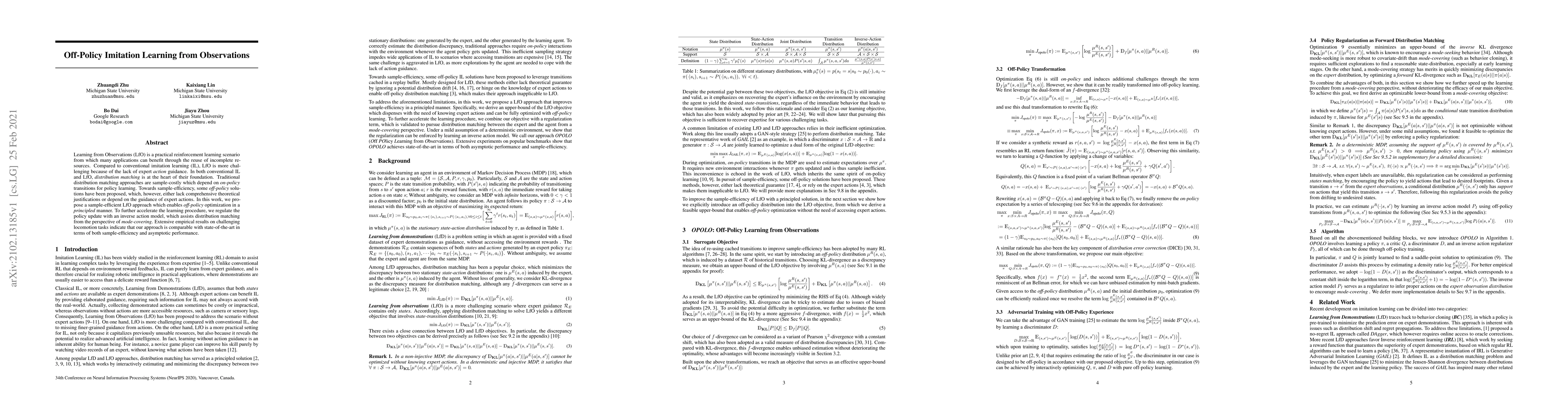 This paper proposes a sample-efficient off-policy imitation learning approach for Learning from Observations, addressing the challenge of lacking expert action guidance. It employs an inverse action model to enhance distribution matching and achieves competitive performance in locomotion tasks.