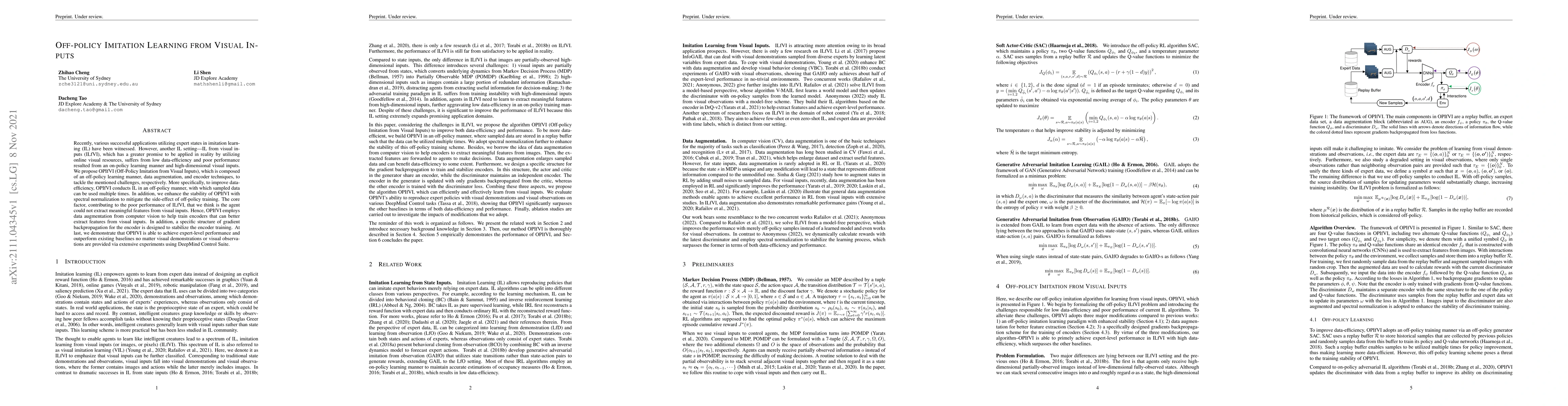 This paper proposes OPIfVI, an off-policy imitation learning method for visual inputs, addressing low data-efficiency and poor performance through off-policy learning, data augmentation, and encoder techniques. OPIfVI enhances stability with spectral normalization, and employs computer vision augmentation to train better feature extractors, achieving expert-level performance.