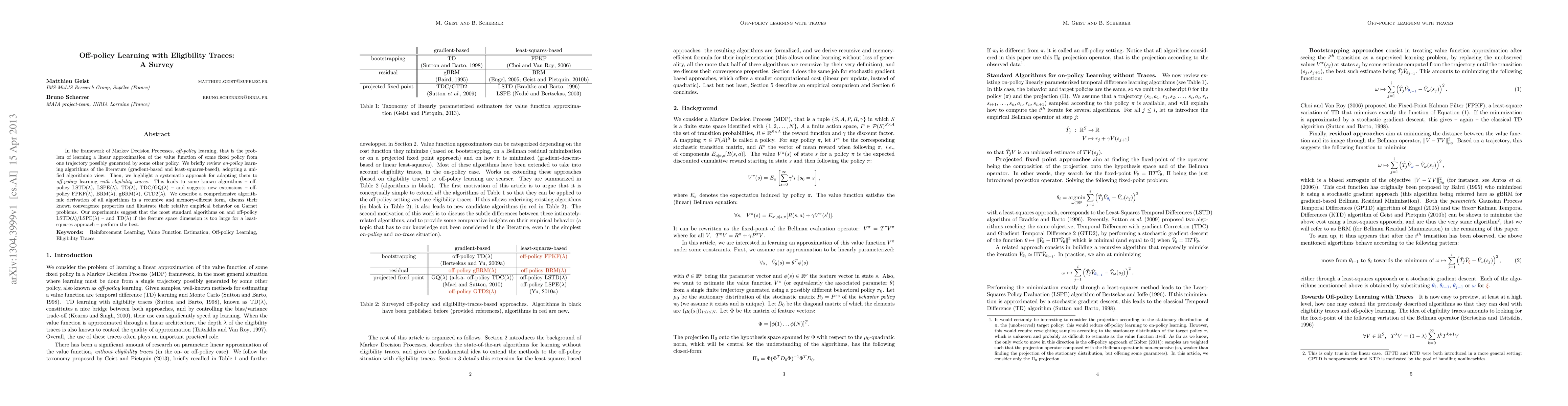 This paper surveys off-policy learning algorithms in Markov Decision Processes, focusing on adapting on-policy methods using eligibility traces. It presents a comprehensive algorithmic derivation and discusses convergence properties, concluding that off-policy LSTD(\lambda)/LSPE(\lambda) and TD(\lambda) perform best in empirical tests.