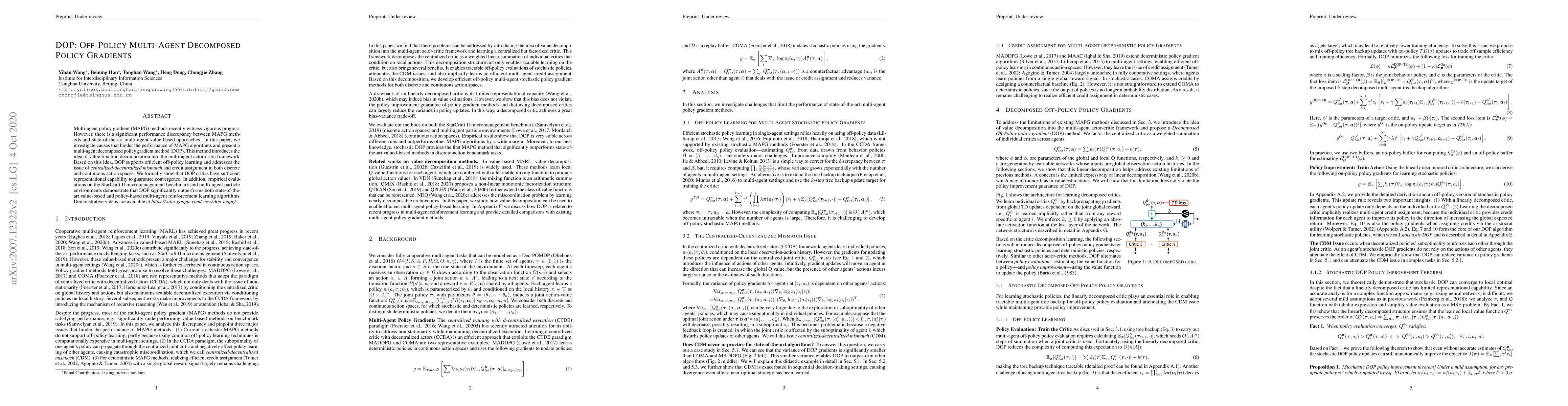 This paper introduces a multi-agent decomposed policy gradient method (DOP) that leverages value function decomposition within an actor-critic framework to enhance off-policy learning and address issues like centralized-decentralized mismatch and credit assignment. Empirical results show DOP outperforms both value-based and policy-based multi-agent reinforcement learning methods.