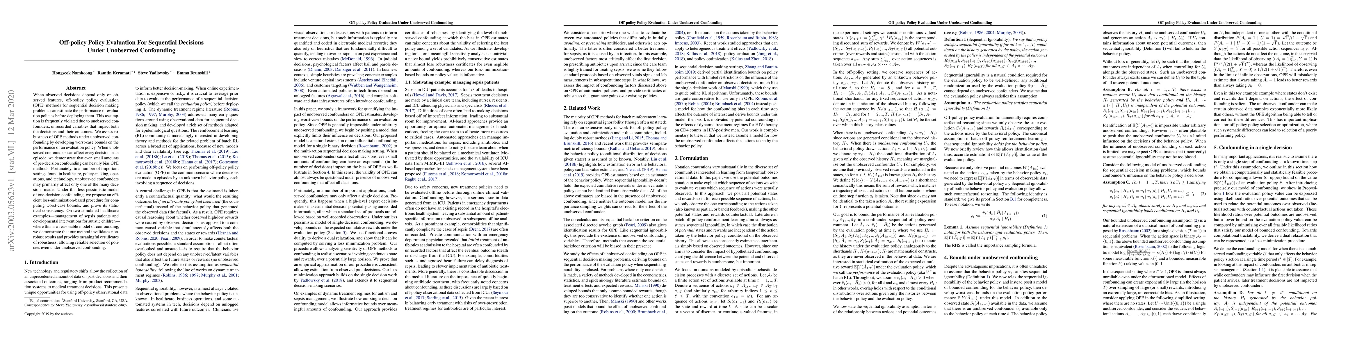 This paper evaluates the robustness of off-policy policy evaluation methods under unobserved confounding, demonstrating significant bias when confounders affect all decisions. It proposes a loss-minimization-based procedure for settings where confounders impact only one decision, proving its consistency and showing its effectiveness through healthcare simulations.