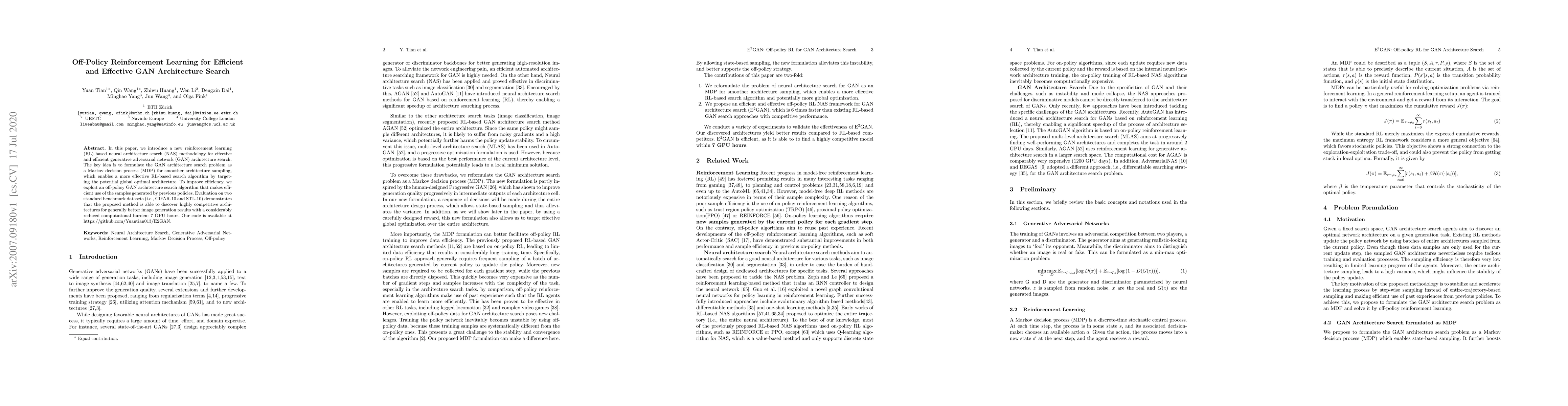 This paper proposes an off-policy reinforcement learning approach for efficient neural architecture search in GANs, framing the search as a Markov decision process to target optimal architectures. The method leverages past samples for improved efficiency, achieving competitive results on CIFAR-10 and STL-10 with significantly reduced computational costs.
