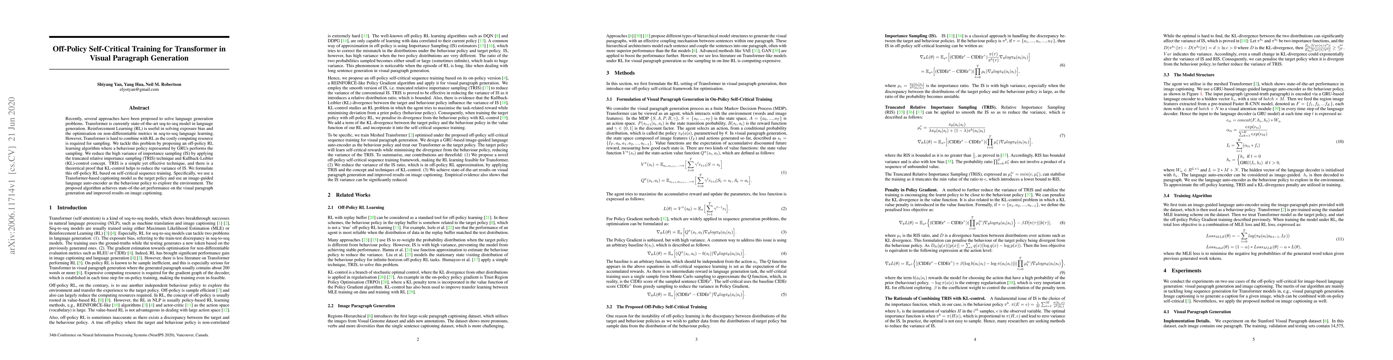 This paper proposes an off-policy reinforcement learning approach for training Transformer models in visual paragraph generation, addressing the high computational cost of on-policy methods. The method uses GRUs for sampling and TRIS with KL-control to reduce variance, achieving state-of-the-art results in visual paragraph generation and improved image captioning performance.