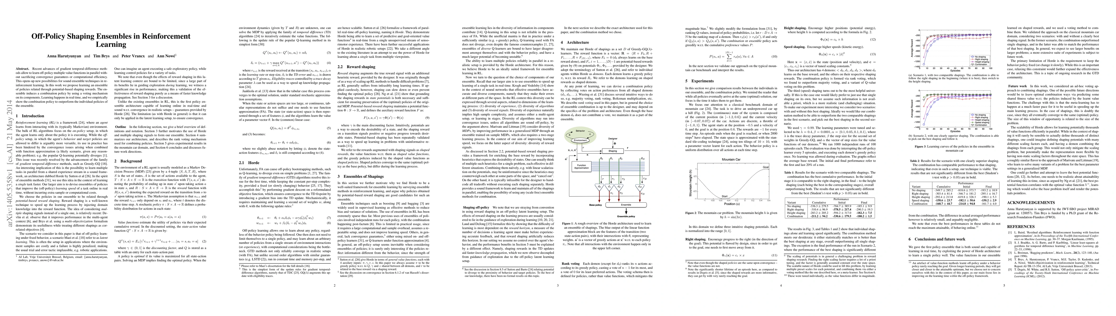 This paper proposes an ensemble of off-policy reinforcement learning policies that use potential-based shaping rewards, combining them via a voting mechanism to achieve superior performance compared to individual ensemble policies. The method maintains convergence guarantees and computational efficiency.