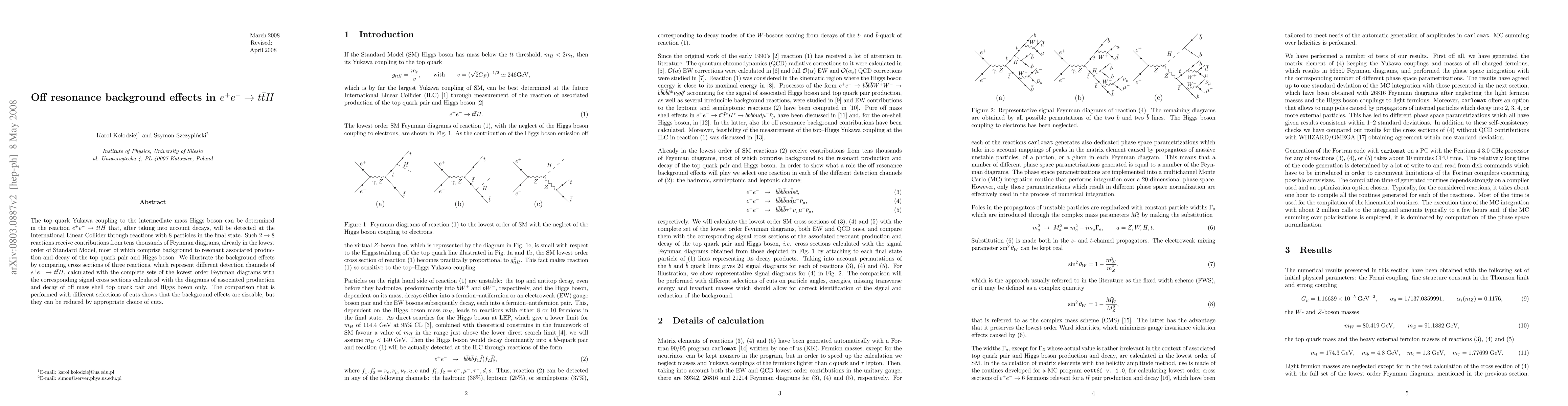 This paper investigates the off-resonance background effects in the e+e- -> t anti-t H reaction, determining the top quark Yukawa coupling to the Higgs boson. It compares signal and background cross sections, showing that while background effects are significant, they can be mitigated with suitable selection cuts.