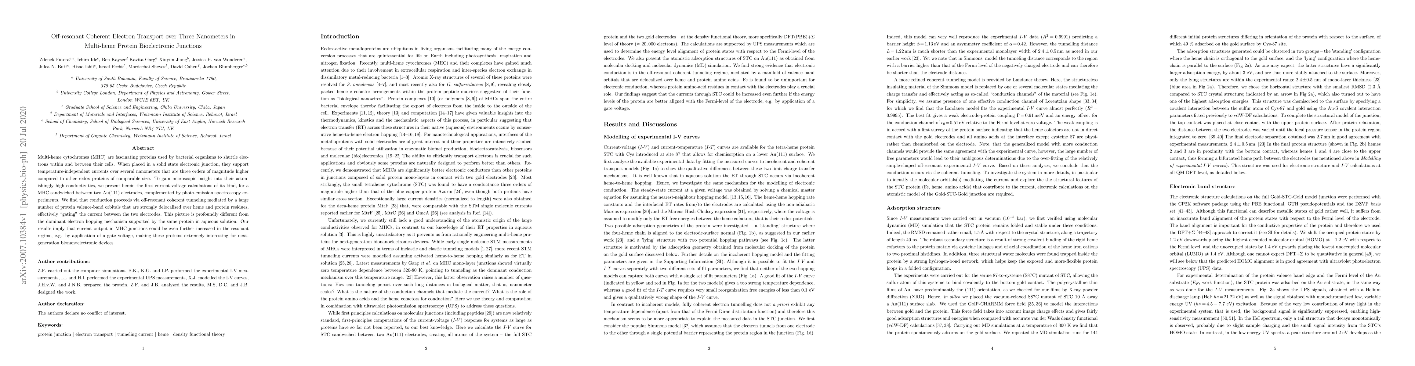 This paper investigates the high conductivity of multi-heme cytochromes in solid-state electronic junctions via off-resonant coherent electron tunneling, revealing a mechanism distinct from electron hopping in aqueous solutions. The findings suggest potential for enhanced current output in bionanoelectronic devices through resonant conditions.