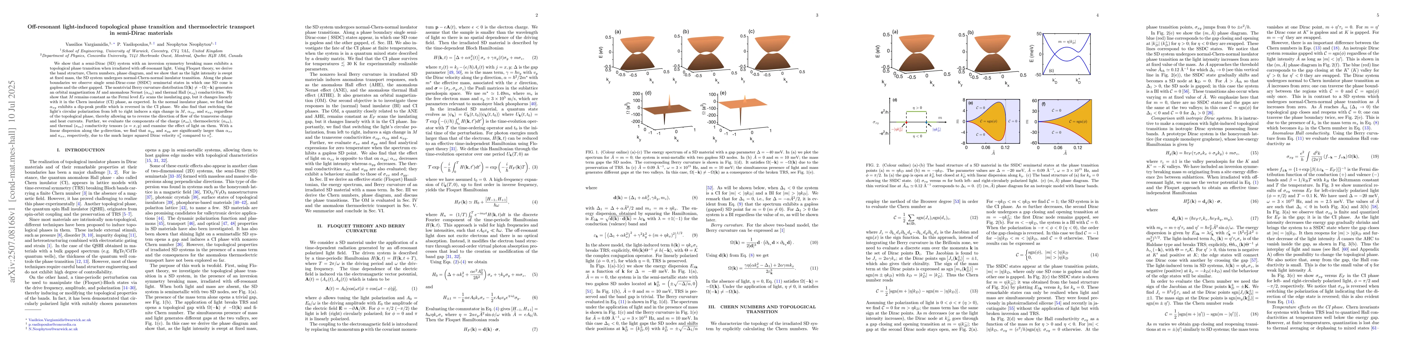 We show that a semi-Dirac (SD) system with an inversion symmetry breaking mass exhibits a topological phase transition when irradiated with off-resonant light. Using Floquet theory, we derive the band structure, Chern numbers, phase diagram, and we show that as the light intensity is swept at fixed mass, the SD system undergoes normal-Chern-normal insulator transition. Along the phase boundaries we observe single semi-Dirac-cone (SSDC) semimetal states in which one SD cone is gapless and the other gapped. The nontrivial Berry curvature distribution $\Omega(\mathbf{k}) \neq -\Omega ( - \mathbf{k} )$ generates an orbital magnetization $M$ and anomalous Nernst ($\alpha_{xy}$) and thermal Hall ($\kappa_{xy}$) conductivities. We show that $M$ remains constant as the Fermi level $E_F$ scans the insulating gap, but it changes linearly with it in the Chern insulator (CI) phase, as expected. In the normal insulator phase, we find that $\alpha_{xy}$ exhibits a dip-peak profile which is reversed in the CI phase. We also find that switching the light's circular polarization from left to right induces a sign change in $M$, $\alpha_{xy}$, and $\kappa_{xy}$, regardless of the topological phase, thereby allowing us to reverse the direction of flow of the transverse charge and heat currents. Further, we evaluate the components of the charge ($\sigma_{aa}$), thermoelectric ($\alpha_{aa}$), and thermal ($\kappa_{aa}$) conductivity tensors ($a=x, y$) and examine the effect of light on them. With a linear dispersion along the $y$-direction, we find that $\alpha_{yy}$ and $\kappa_{yy}$ are significantly larger than $\alpha_{xx}$ and $\kappa_{xx}$, respectively, due to the much larger squared Dirac velocity $v_y^2$ compared to $v_x^2$.