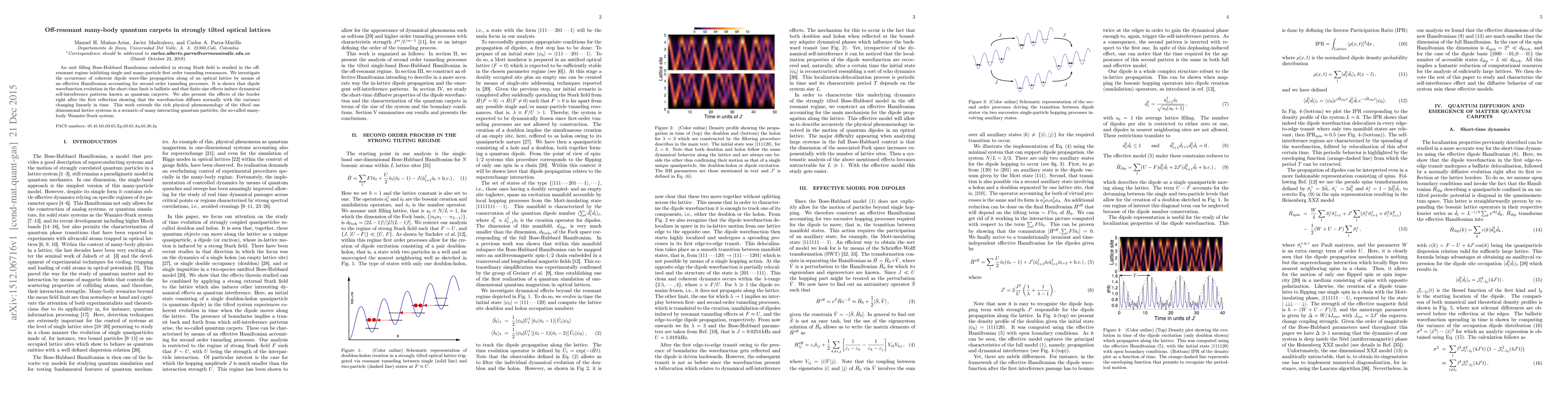 This paper studies the behavior of a Bose-Hubbard Hamiltonian in a strongly tilted optical lattice under off-resonant conditions, revealing ballistic dipole wave-like propagation and the emergence of quantum carpets due to dynamical self-interference patterns. The work highlights the diffusion dynamics near the first reflection and extends the understanding of many-body Wannier-Stark systems.