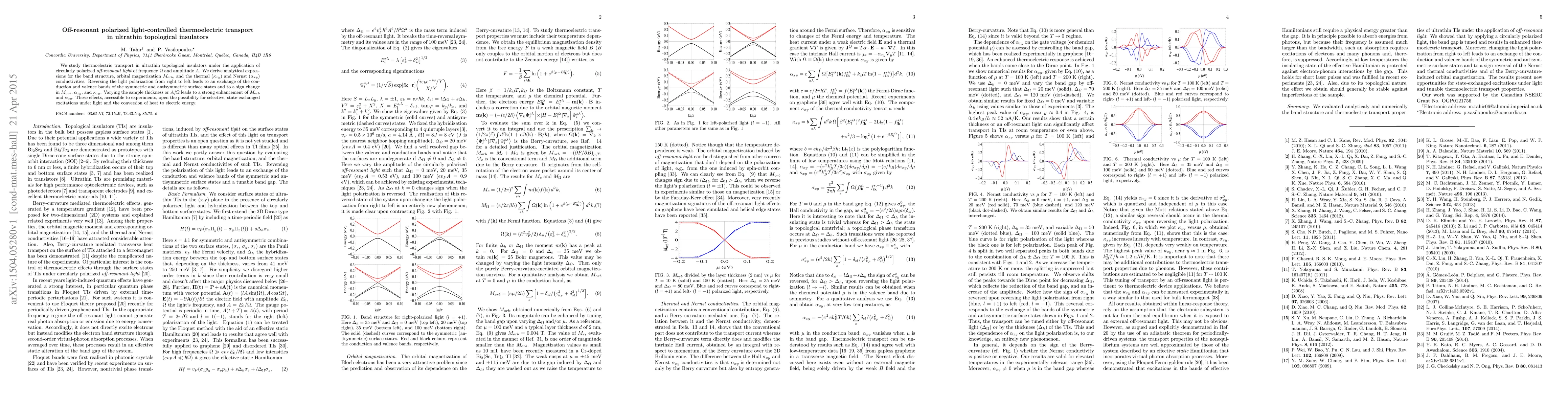 This paper investigates thermoelectric transport in ultrathin topological insulators under off-resonant polarized light, deriving expressions for key conductivities. Switching light polarization inverts band structures and changes magnetization and thermoelectric signals, offering potential for light-controlled heat-to-electricity conversion.