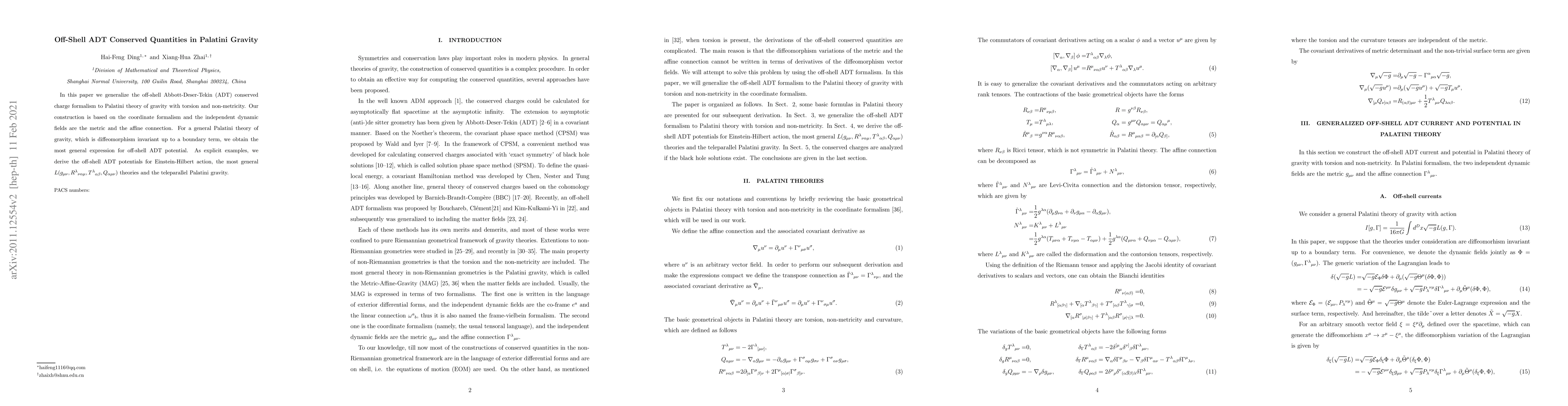This paper extends the off-shell Abbott-Deser-Tekin (ADT) conserved charge formalism to Palatini gravity, considering torsion and non-metricity. The authors derive the most general off-shell ADT potential for general Palatini theories, applying this to Einstein-Hilbert, $L(g_{\mu\nu}, R^{\lambda}{}_{\nu\alpha\mu}, T^{\lambda}{}_{\alpha\beta}, Q_{\alpha\mu\nu})$, and teleparallel Palatini gravity.