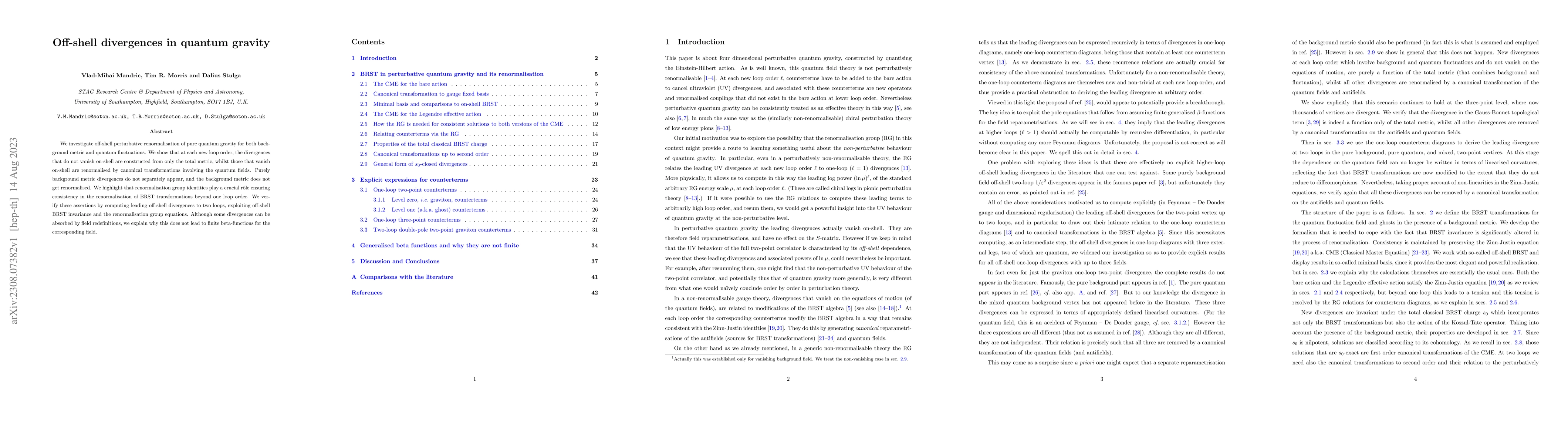 We investigate off-shell perturbative renormalisation of pure quantum gravity for both background metric and quantum fluctuations. We show that at each new loop order, the divergences that do not vanish on-shell are constructed from only the total metric, whilst those that vanish on-shell are renormalised by canonical transformations involving the quantum fields. Purely background metric divergences do not separately appear, and the background metric does not get renormalised. We highlight that renormalisation group identities play a crucial role ensuring consistency in the renormalisation of BRST transformations beyond one loop order. We verify these assertions by computing leading off-shell divergences to two loops, exploiting off-shell BRST invariance and the renormalisation group equations. Although some divergences can be absorbed by field redefinitions, we explain why this does not lead to finite beta-functions for the corresponding field.
