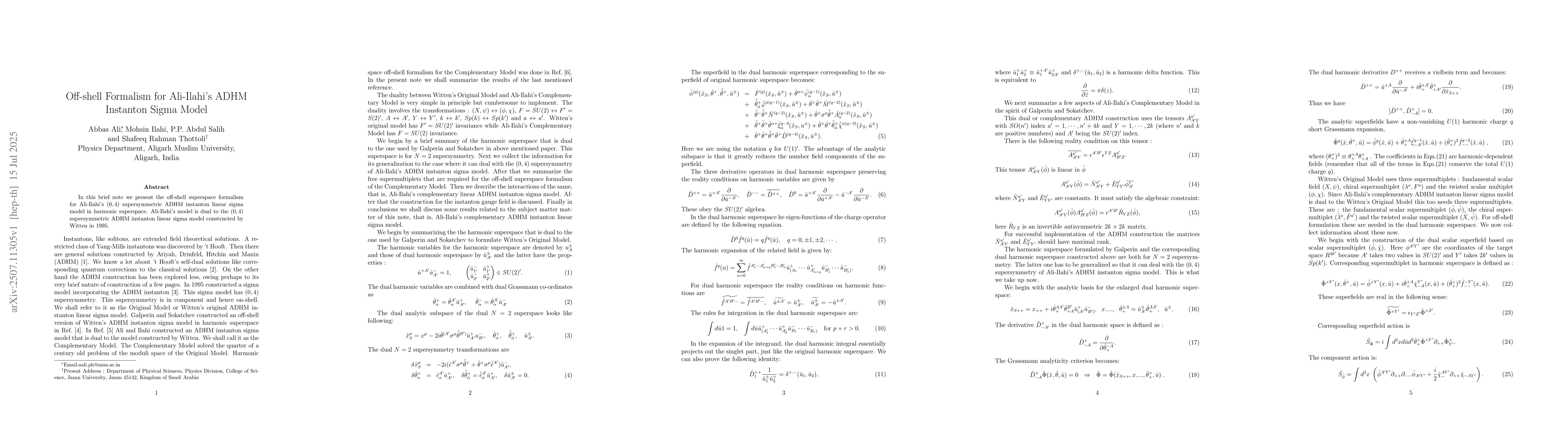 In this brief note we present the off-shell superspace formalism for Ali-Ilahi's $(0, 4)$ supersymmetric ADHM instanton linear sigma model in harmonic superspace. Ali-Ilahi's model is dual to the $(0, 4)$ supersymmetric ADHM instanton linear sigma model constructed by Witten in 1995.