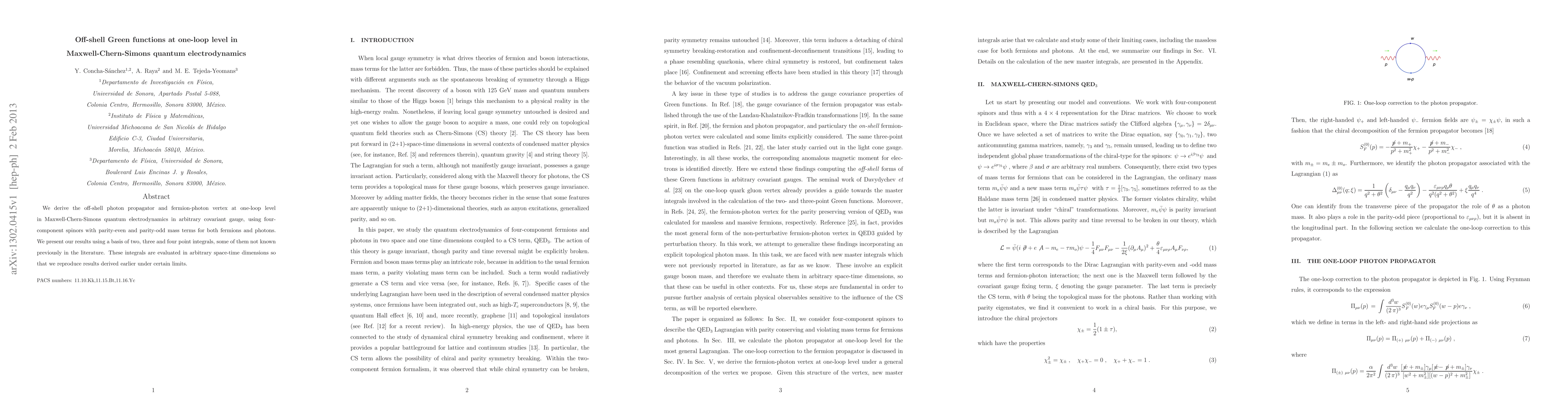 This paper derives one-loop off-shell Green functions, including the photon propagator and fermion-photon vertex, in Maxwell-Chern-Simons quantum electrodynamics, employing four-component spinors and new basis integrals evaluated in any space-time dimension. These novel results extend previous findings in specific limits.