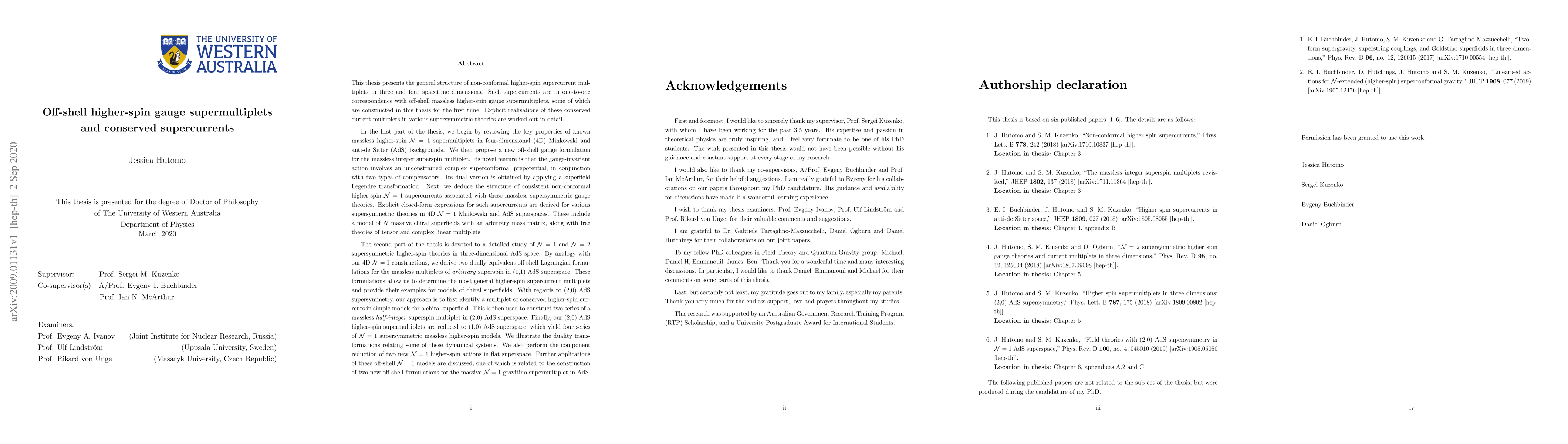 This thesis presents the general structure of non-conformal higher-spin supercurrent multiplets in three and four spacetime dimensions. Such supercurrents are in one-to-one correspondence with off-shell massless higher-spin gauge supermultiplets, some of which are constructed in this thesis for the first time. In the first part of the thesis, we propose a new off-shell formulation for a massless integer superspin multiplet, whose gauge-invariant action involves an unconstrained complex superconformal prepotential, in conjunction with two types of compensators. Next, we deduce the structure of consistent non-conformal higher-spin ${\cal N}=1$ supercurrents. Explicit expressions for such supercurrents are derived for various theories in 4D ${\cal N}=1$ Minkowski and AdS superspaces. These include a model of $N$ massive chiral superfields with an arbitrary mass matrix, along with free theories of tensor and complex linear superfields. The second part of the thesis is devoted to ${\cal N}=1$ and ${\cal N}=2$ supersymmetric higher-spin theories in 3D AdS space. Two dually equivalent off-shell Lagrangian formulations for the massless multiplets of arbitrary superspin in (1,1) AdS superspace and their corresponding supercurrents are derived. With regards to (2,0) AdS supersymmetry, we identify a multiplet of conserved higher-spin currents in models for a chiral superfield, which is then used to construct two series of a massless half-integer superspin multiplet. Finally, our (2,0) AdS supermultiplets are reduced to (1,0) AdS superspace, yielding four series of ${\cal N}=1$ supersymmetric higher-spin models. Further applications of these massless models are discussed, one of which is related to the construction of two new off-shell formulations for the massive ${\cal N}=1$ gravitino supermultiplet in AdS.