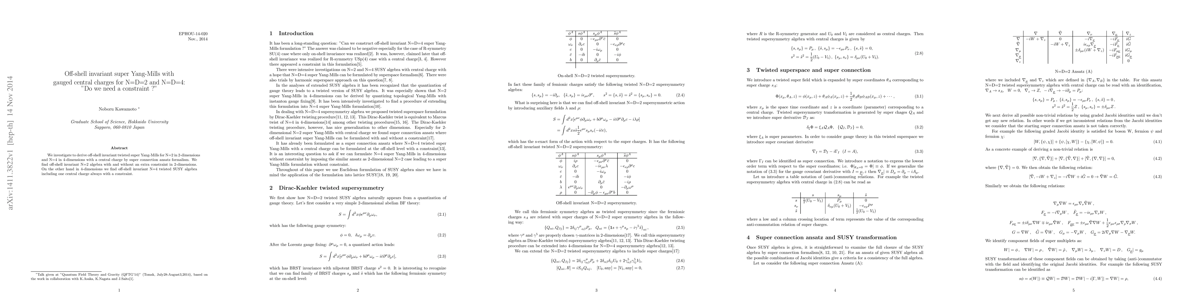 We investigate to derive off-shell invariant twisted super Yang-Mills for N=2 in 2-dimensions and N=4 in 4-dimensions with a central charge by super connection ansatz formalism. We find off-shell invariant N=2 algebra with and without an extra constraint in 2-dimensions. On the other hand in 4-dimensions we find off-shell invariant N=4 twisted SUSY algebra including one central charge always with a constraint.