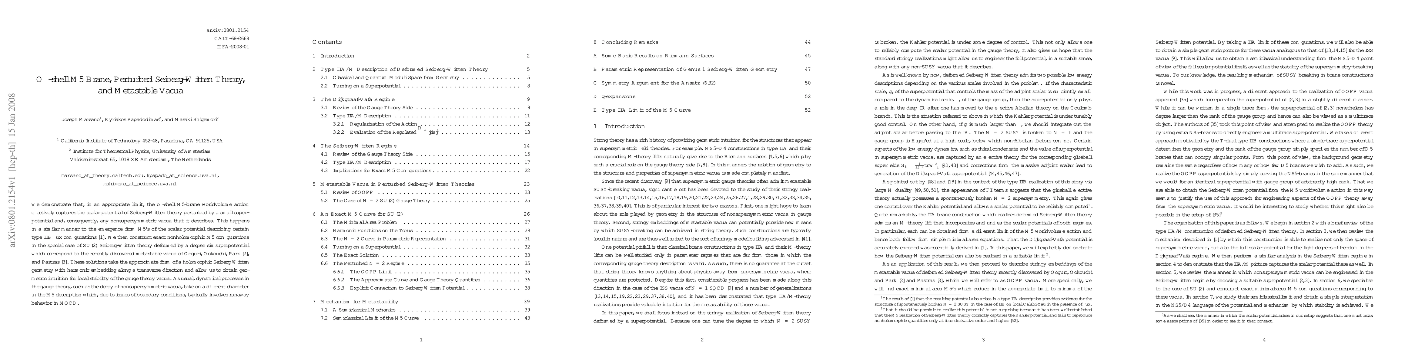 This paper shows that the off-shell M5-brane worldvolume action can describe the scalar potential of perturbed Seiberg-Witten theory, including nonsupersymmetric vacua, similarly to type IIB flux configurations. It constructs exact M5 configurations for SU(2) Seiberg-Witten theory deformed by a superpotential, providing geometric insights into metastable vacua and their local stability.