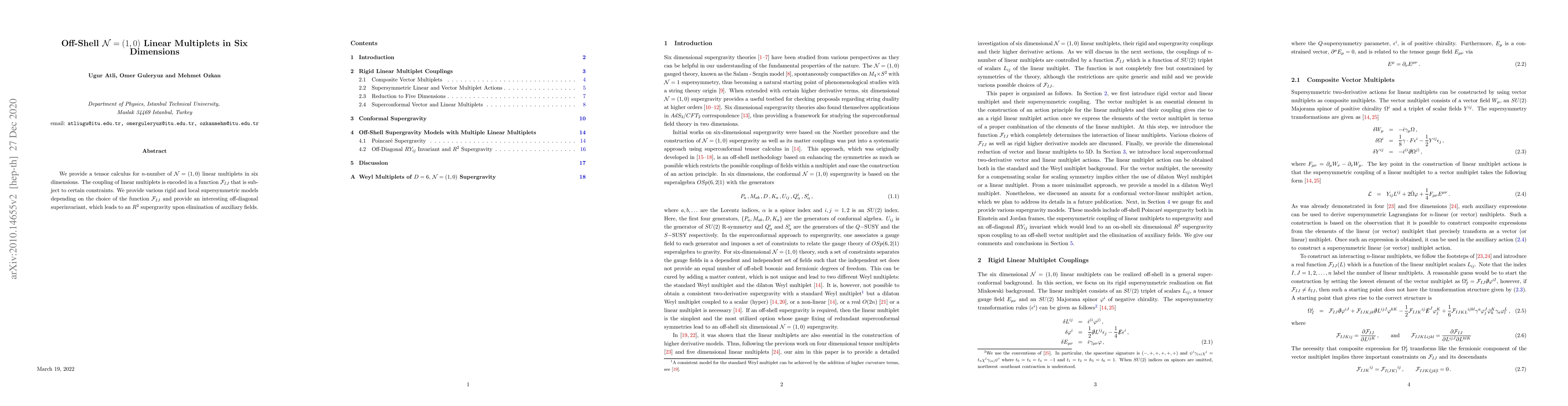 We provide a tensor calculus for $n$-number of ${\mathcal N}=(1,0)$ linear multiplets in six dimensions. The coupling of linear multiplets is encoded in a function ${\mathcal F}_{IJ}$ that is subject to certain constraints. We provide various rigid and local supersymmetric models depending on the choice of the function ${\mathcal F}_{IJ}$ and provide an interesting off-diagonal superinvariant, which leads to an $R^2$ supergravity upon elimination of auxiliary fields.