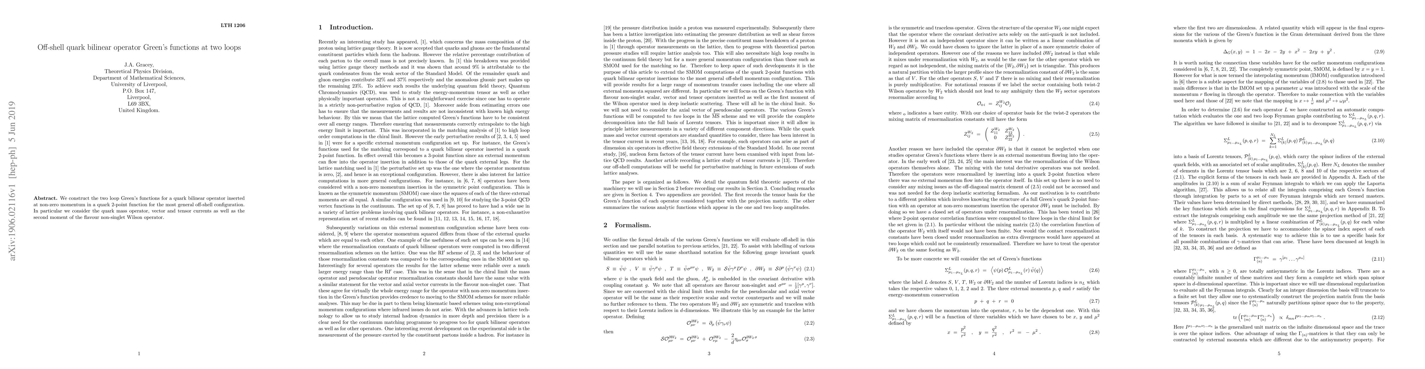 This paper calculates two-loop Green's functions for various quark bilinear operators, including mass operator, vector current, tensor current, and flavor non-singlet Wilson operator, in the most general off-shell configuration.