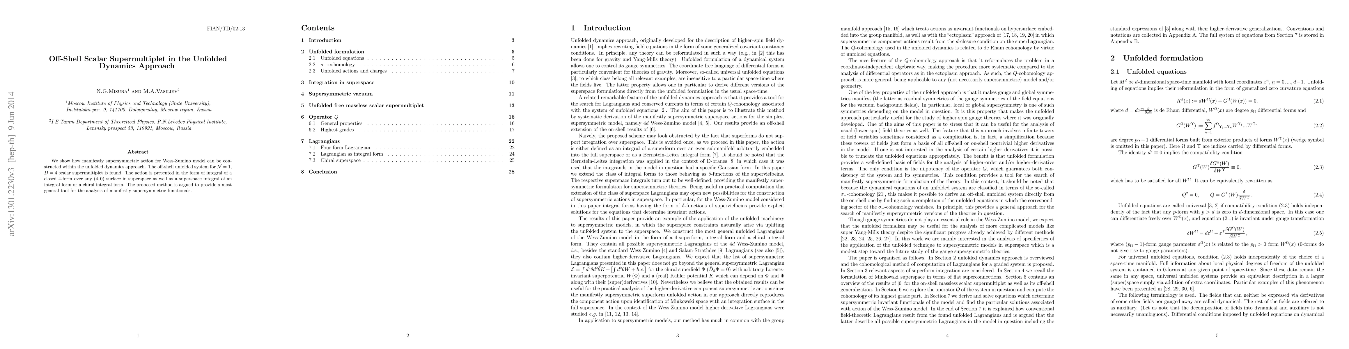 This paper presents a manifestly supersymmetric action for the Wess-Zumino model using the unfolded dynamics approach, constructing an off-shell system for the N=1, D=4 scalar supermultiplet. The action is expressed in terms of integrals over superspace, offering a general tool for analyzing supersymmetric functionals.