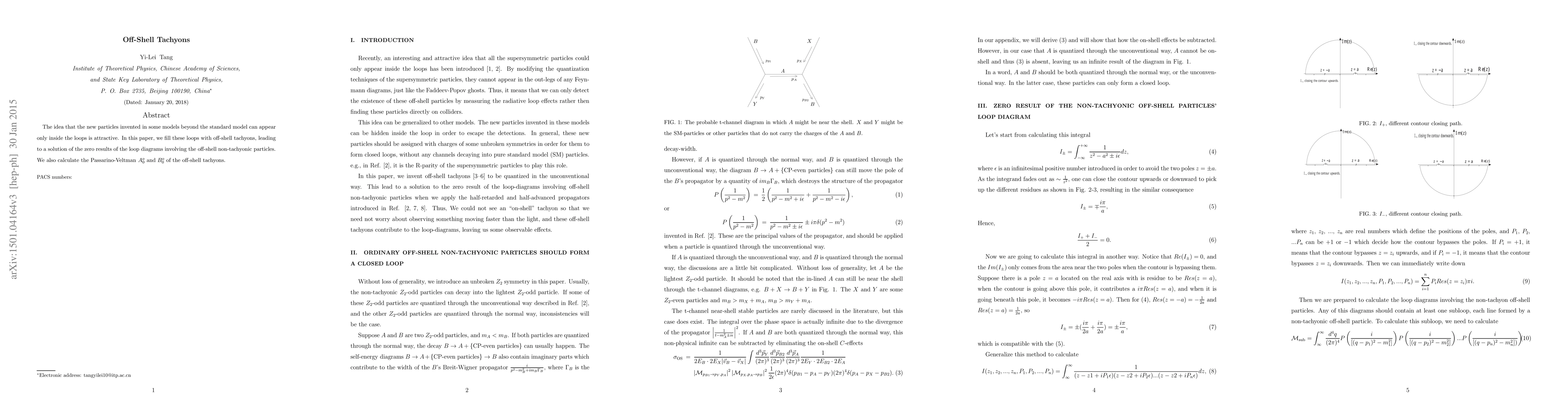 The idea that the new particles invented in some models beyond the standard model can appear only inside the loops is attractive. In this paper, we fill these loops with off-shell tachyons, leading to a solution of the zero results of the loop diagrams involving the off-shell non-tachyonic particles. We also calculate the Passarino-Veltman $A_0^o$ and $B_0^o$ of the off-shell tachyons.