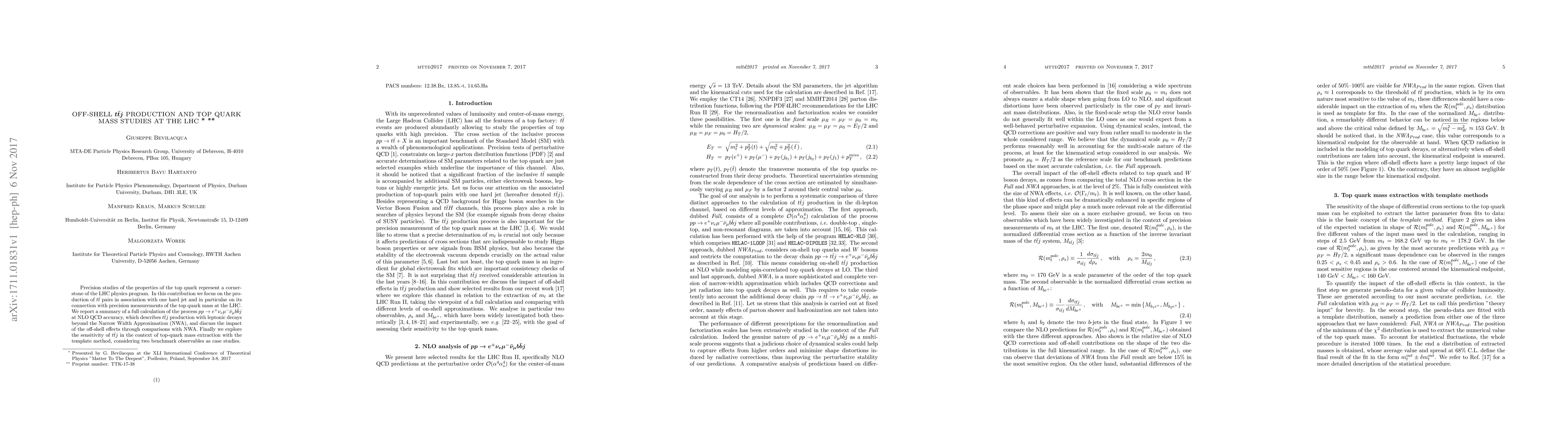 Precision studies of the properties of the top quark represent a cornerstone of the LHC physics program. In this contribution we focus on the production of $t\bar{t}$ pairs in association with one hard jet and in particular on its connection with precision measurements of the top quark mass at the LHC. We report a summary of a full calculation of the process $pp \to e^+\nu_e\mu^-\bar{\nu}_\mu b \bar{b}j$ at NLO QCD accuracy, which describes $t\bar{t}j$ production with leptonic decays beyond the Narrow Width Approximation (NWA), and discuss the impact of the off-shell effects through comparisons with NWA. Finally we explore the sensitivity of $t\bar{t}j$ in the context of top-quark mass extraction with the template method, considering two benchmark observables as case studies.