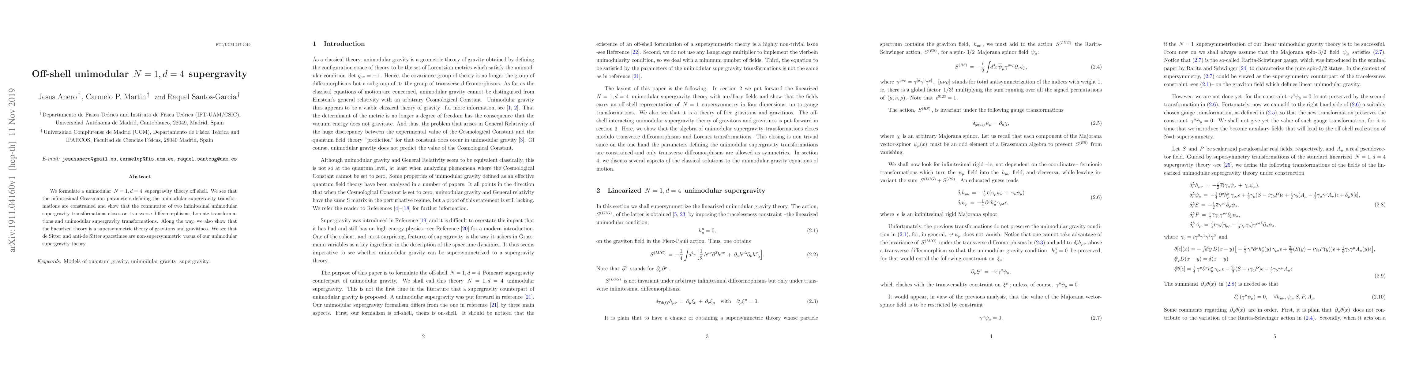 We formulate a unimodular N=1, d=4 supergravity theory off shell. We see that the infinitesimal Grassmann parameters defining the unimodular supergravity transformations are constrained and show that the conmutator of two infinitesinal unimodular supergravity transformations closes on transverse diffeomorphisms, Lorentz transformations and unimodular supergravity transformations. Along the way, we also show that the linearized theory is a supersymmetric theory of gravitons and gravitinos. We see that de Sitter and anti-de Sitter spacetimes are non-supersymmetric vacua of our unimodular supergravity theory.