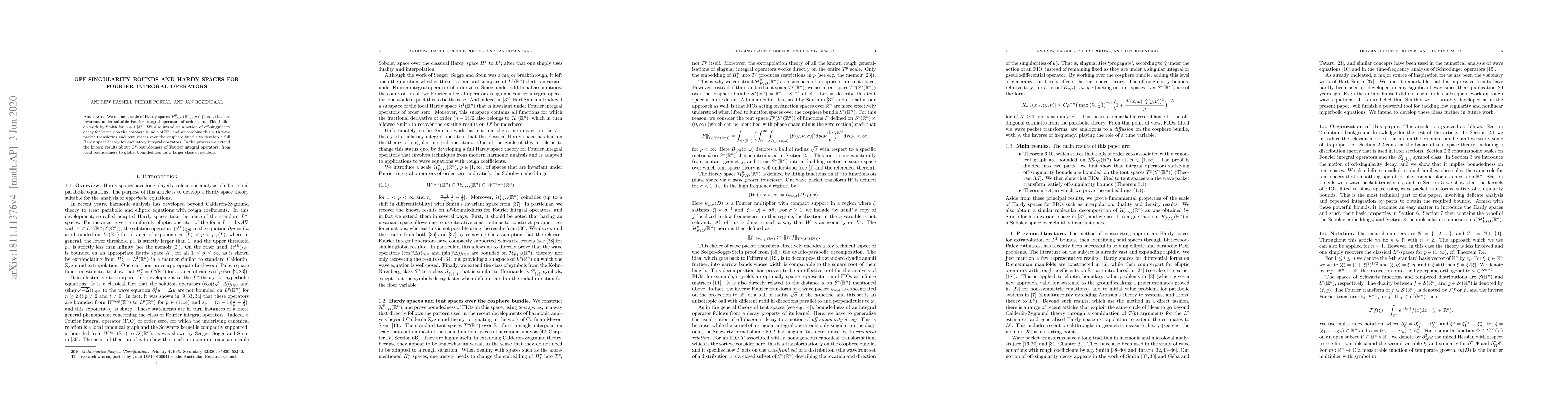 We define a scale of Hardy spaces $\mathcal{H}^{p}_{FIO}(\mathbb{R}^{n})$, $p\in[1,\infty]$, that are invariant under suitable Fourier integral operators of order zero. This builds on work by Smith for $p=1$. We also introduce a notion of off-singularity decay for kernels on the cosphere bundle of $\mathbb{R}^{n}$, and we combine this with wave packet transforms and tent spaces over the cosphere bundle to develop a full Hardy space theory for oscillatory integral operators. In the process we extend the known results about $L^{p}$-boundedness of Fourier integral operators, from local boundedness to global boundedness for a larger class of symbols.