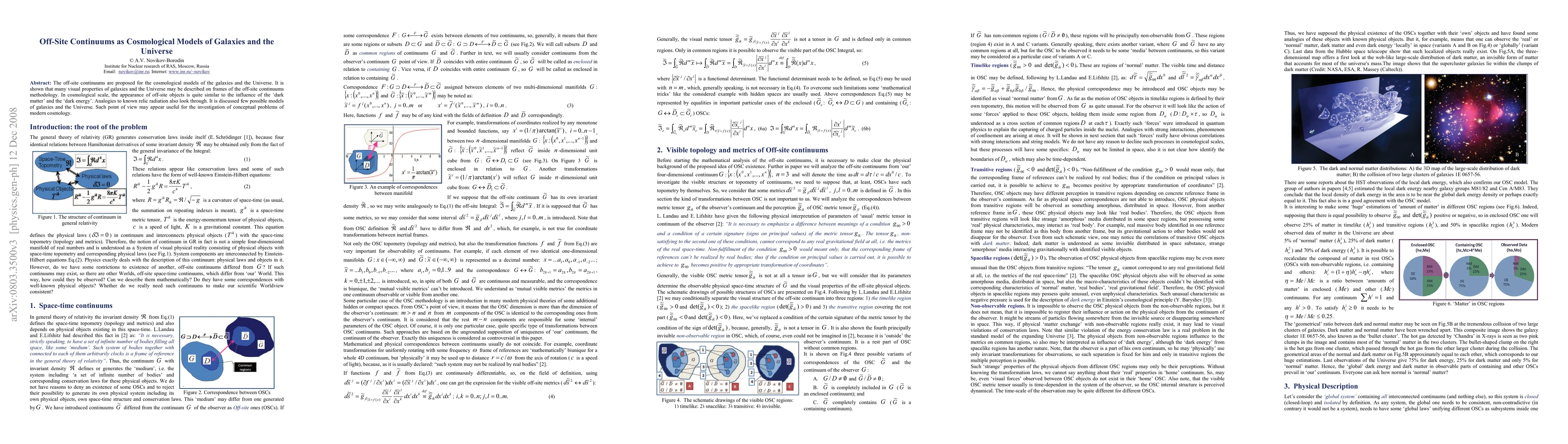 The off-site continuums are proposed for the cosmological models of the galaxies and the Universe. It is shown that many visual properties of galaxies and the Universe may be described on frames of the off-site continuums methodology. In cosmological scale, the appearance of off-site objects is quite similar to the influence of the 'dark matter' and the 'dark energy'. Analogies to known relic radiation also look through. It is discussed few possible models of galaxies and the Universe. Such point of view may appear useful for the investigation of conceptual problems of modern cosmology.